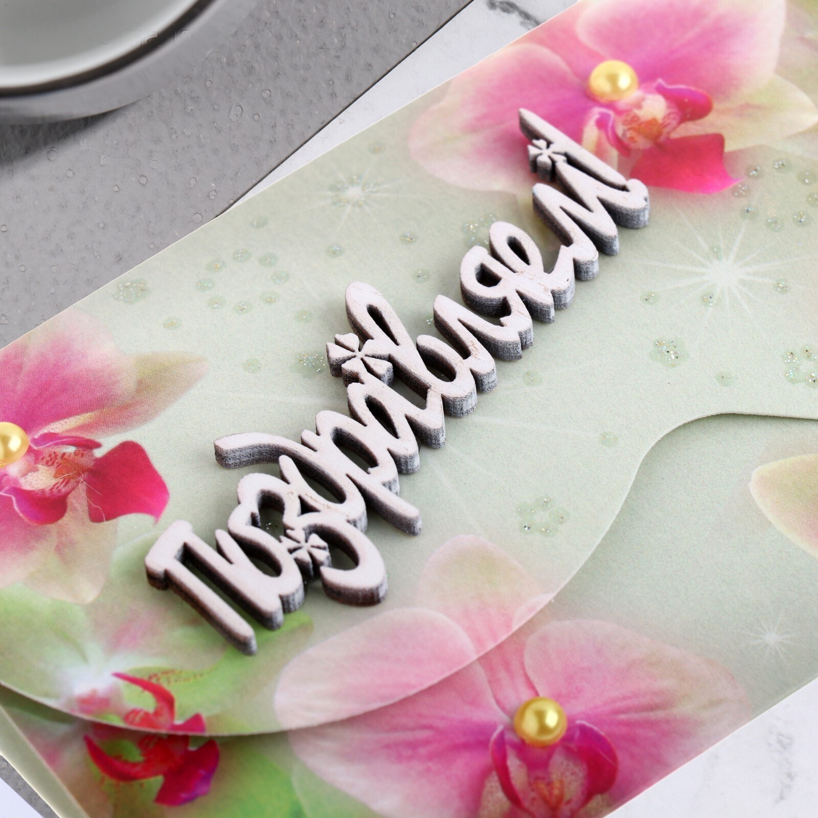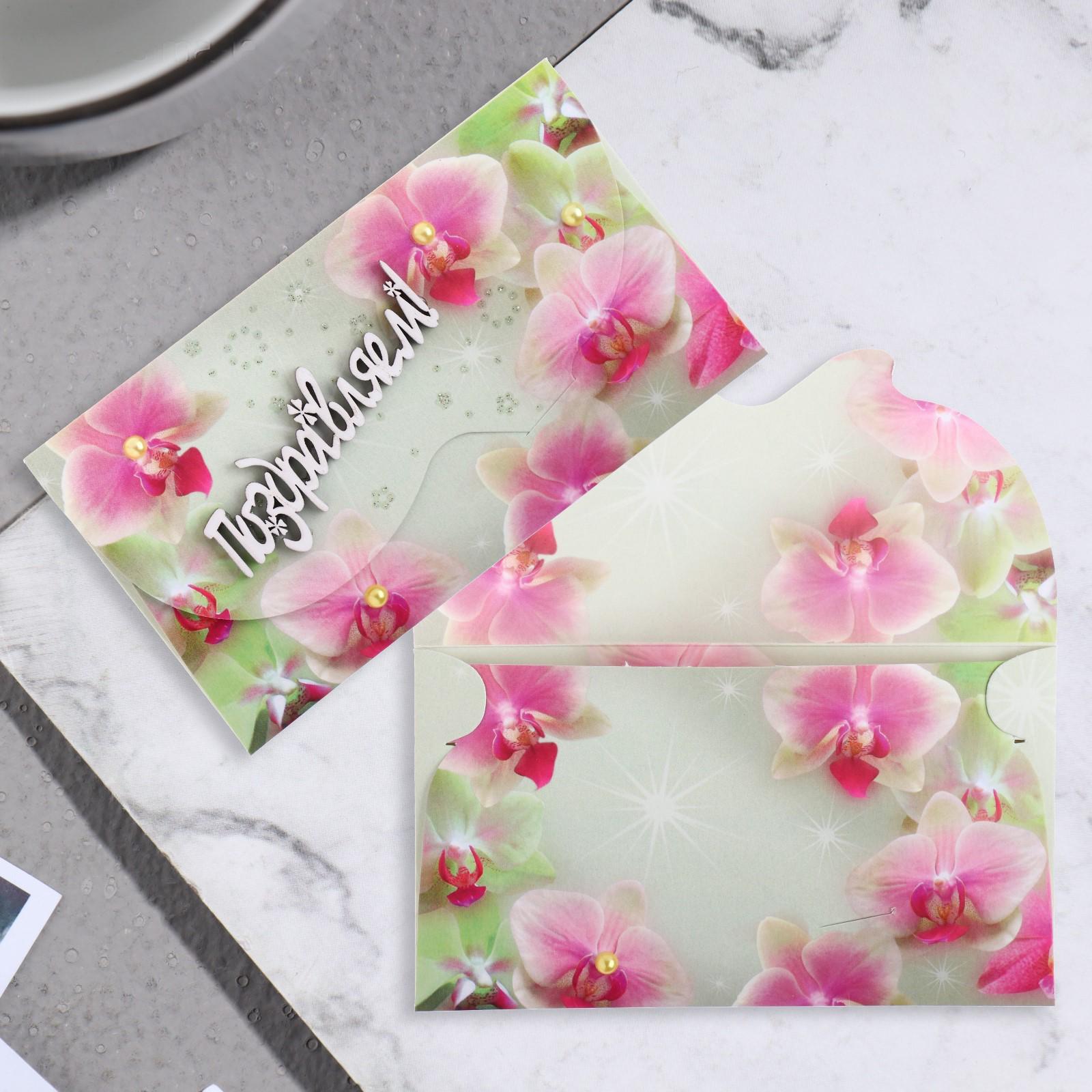 Конверт для денег "Поздравляем!" глитер, розовые орхидеи, 19х9 см