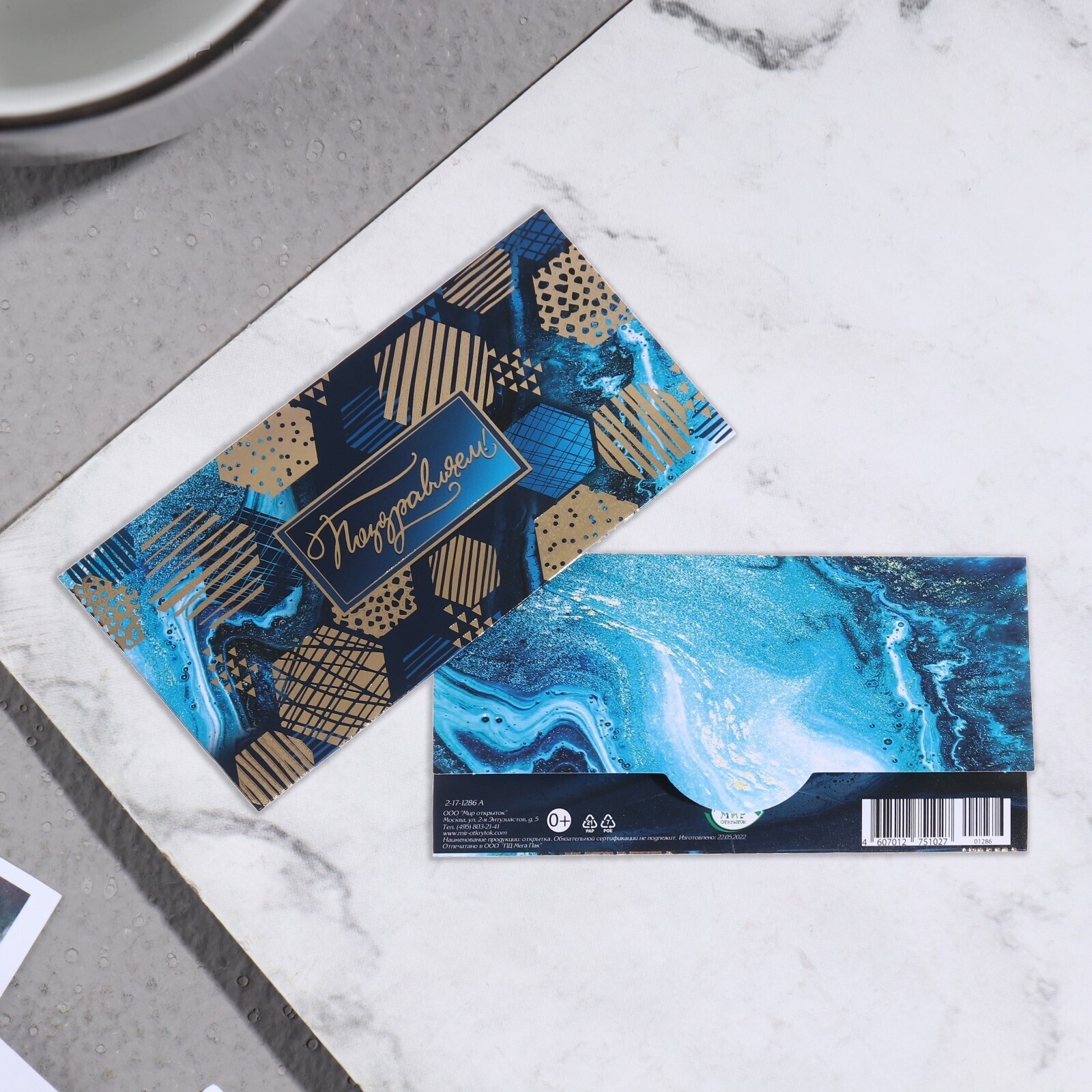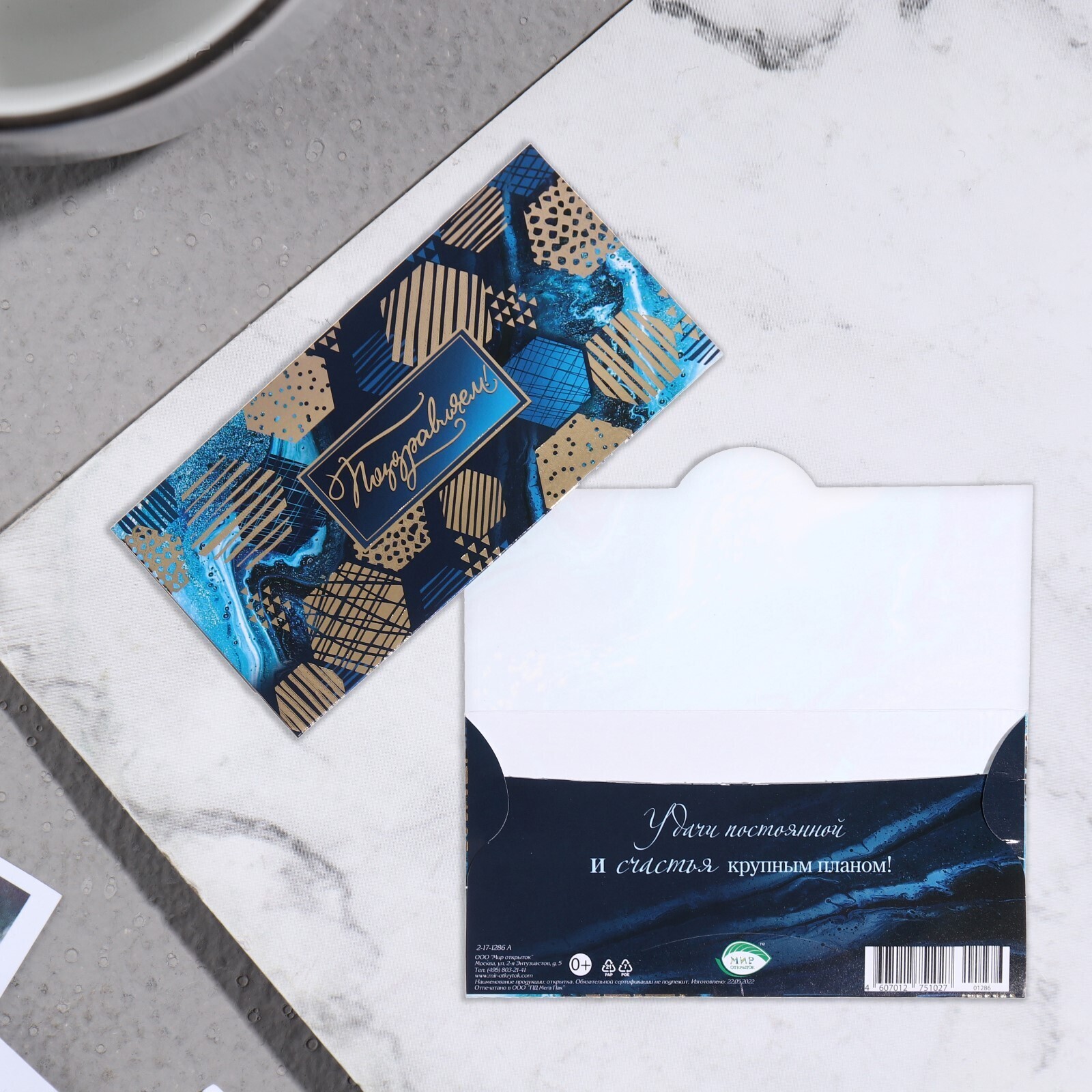 Конверт для денег "Поздравляем!" тиснение, синий фон, шестиугольник, 17х8см