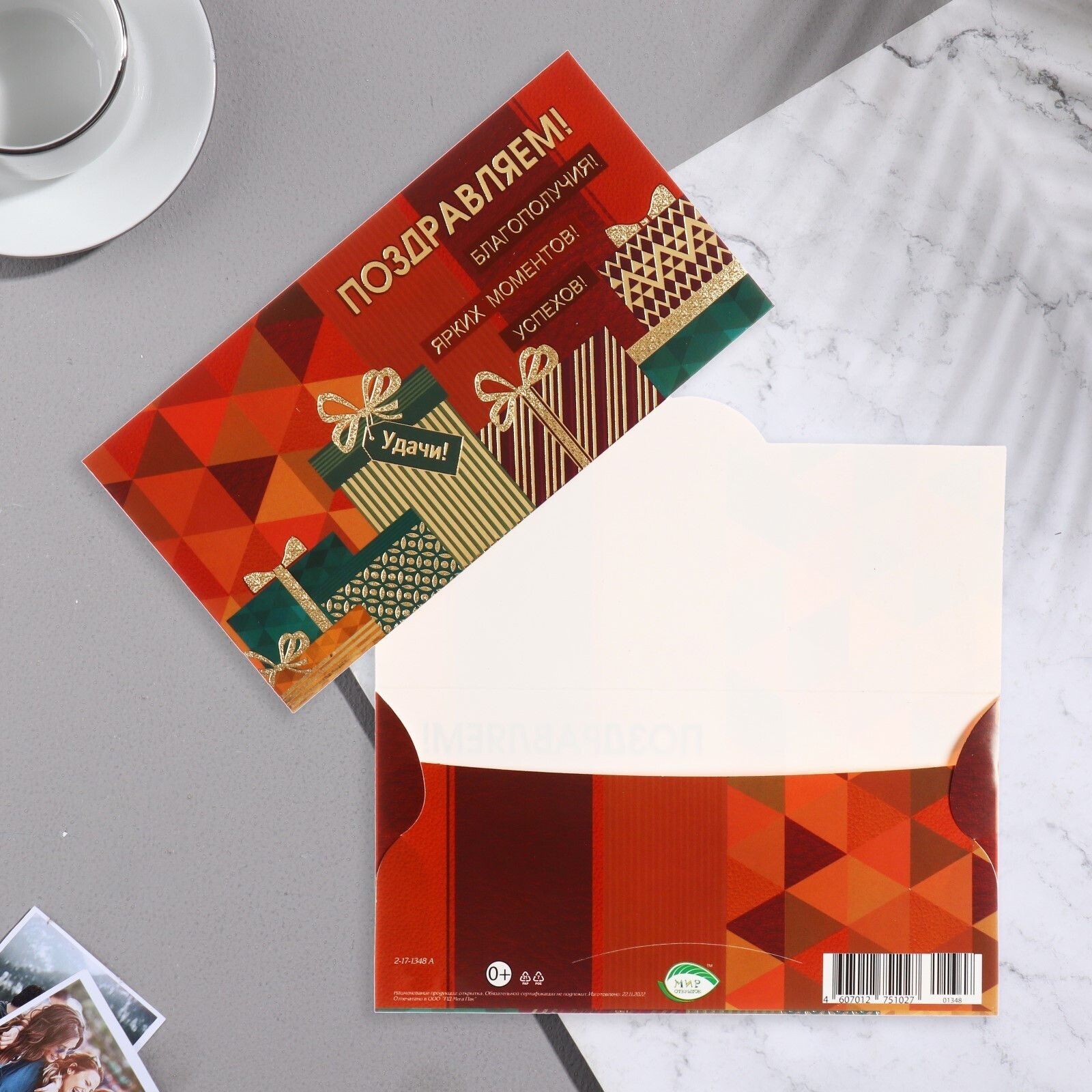 Конверт для денег "Поздравляем!" тиснение, подарки, коричный фон, 16,5х8,5 см
