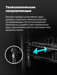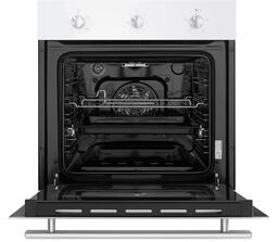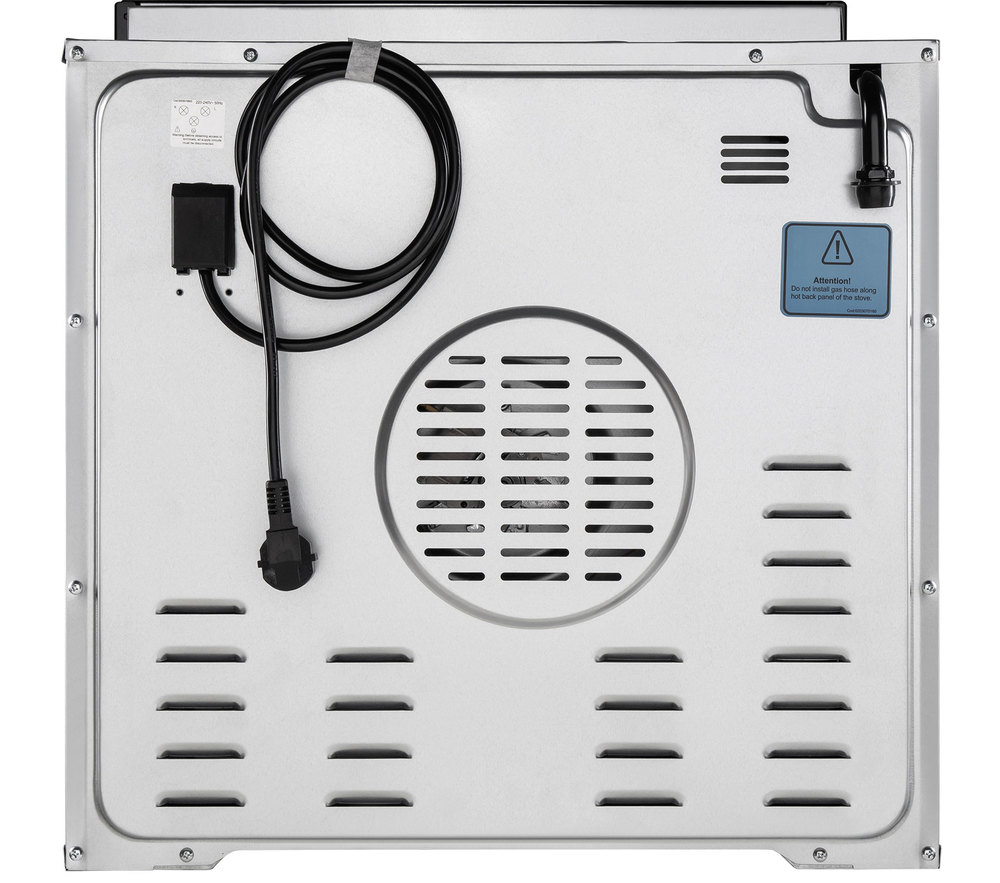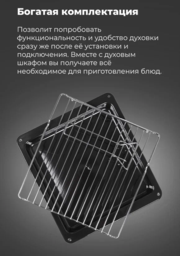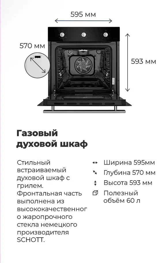 Стильный газовый встраиваемый духовой шкаф высокого качества сборки, актуального дизайна и расширенного функционала. Объем 60 л при стандартной ширине духового шкафа 60 см позволяет готовить одновременно несколько блюд, разместив решетку или противень на одном из 5-ти уровней боковых направляющих. Один уровень оснащен удобными телескопическими направляющими. Внутреннее покрытие камеры выполнено из специальной легкоочищающейся эмали черного цвета. Фронтальная панель дверцы, лицевая часть блока управления и фасад ручки дверцы сделаны из высококачественного жаропрочного стекла белого цвета, окрашенного по всему объему, что является отличительной чертой бытового прибора премиум-класса. Механическое управление осуществляется цельнометаллическими поворотными ручками. Можно выставить температуру готовки, установить таймер (0-60 мин) и выбрать один из 5 режимов работы: нижний нагрев с вентилятором (конвекция), традиционная готовка, электрический гриль, вентилятор, освещение. Данная модель работает как при открытом, так и при закрытом гриле. Дверца состоит из 3-х жаростойких стекол немецкого производителя SCHOTT. Благодаря подобной конструкции образовывается холодный фронт, что делает процесс приготовления безопасным, исключая возможность ожога при касании. Трамп-линии нанесены на внутреннем стекле для создания визуального эффекта непрозрачности фасада: при выключенном освещении не видно посуду, находящуюся внутри духовой камеры, а при включенном освещении можно в деталях рассмотреть весь процесс готовки. Надежность духового шкафа обеспечивается полным газ-контролем – система, которая перекрывает подачу газа, если потух огонь. Автоматический электроподжиг является дополнительным преимуществом этой модели.