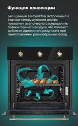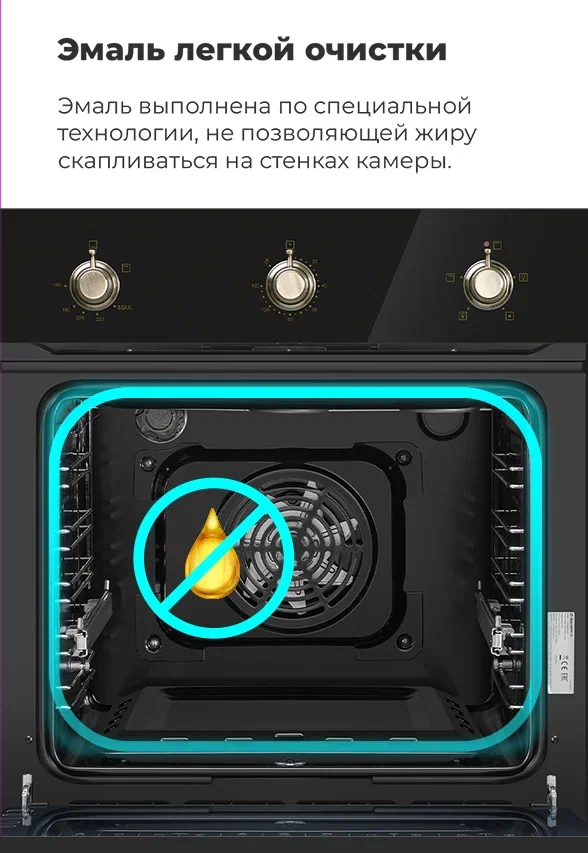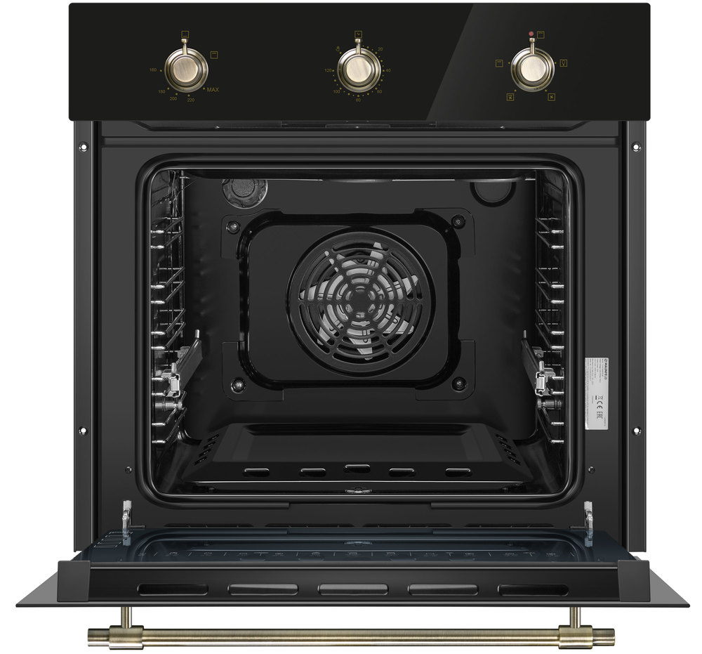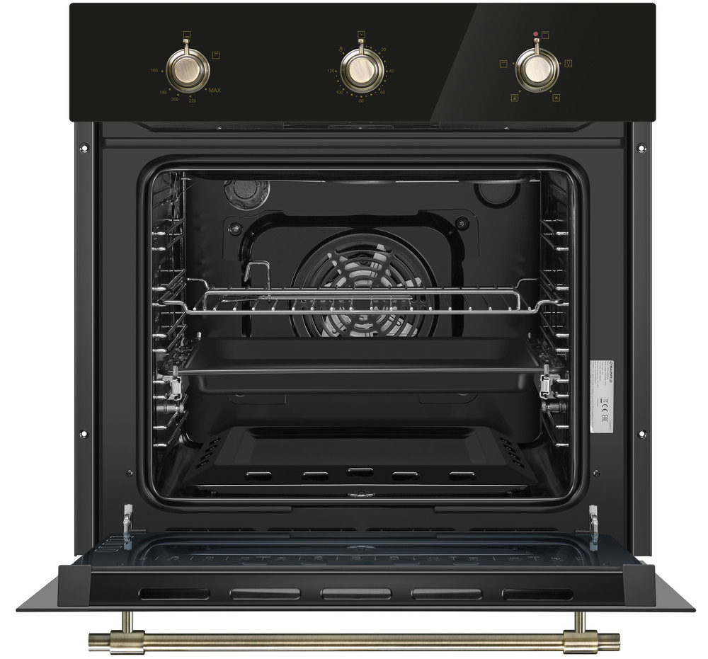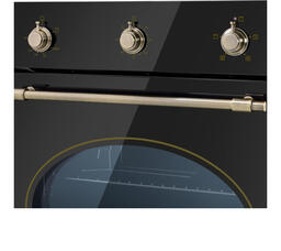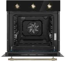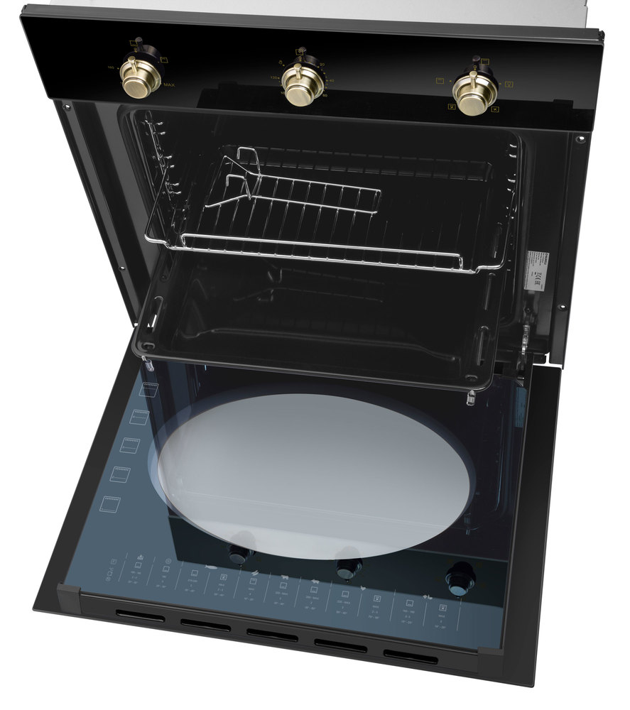 Стильный газовый встраиваемый духовой шкаф высокого качества сборки, актуального дизайна и расширенного функционала.Модель оснащена внутренним энергосберегающим стеклом, которое легко выдвигается и чистится, съёмная дверца; таймер механический с обратным отсчётом. Для управления температурой и режимами работы применяются специальные поворотные переключатели бронзового цвета. Этот черный духовой шкаф - отличный выбор для пользователей, которые хотят получить стильное и надежное устройство, обладающее большим количеством различных функций. Объем 60 л при стандартной ширине духового шкафа 60 см позволяет готовить одновременно несколько блюд, разместив решетку или противень на одном из 5-ти уровней боковых направляющих. Один уровень оснащен удобными телескопическими направляющими. Внутреннее покрытие камеры выполнено из специальной легкоочищающейся эмали черного цвета. Фронтальная панель дверцы, лицевая часть блока управления и фасад ручки дверцы сделаны из высококачественного жаропрочного стекла, окрашенного по всему объему, что является отличительной чертой бытового прибора премиум-класса. Механическое управление осуществляется цельнометаллическими поворотными ручками. Можно выставить температуру готовки, установить таймер (0-55 мин) и выбрать один из 5 режимов работы: нижний газовый нагрев с вентилятором (конвекция), традиционная готовка, вентилятор, освещение. Данная модель работает как при открытом, так и при закрытом гриле. Дверца состоит из 3-х жаростойких стекол немецкого производителя SCHOTT. Благодаря подобной конструкции образовывается холодный фронт, что делает процесс приготовления безопасным, исключая возможность ожога при касании. Надежность духового шкафа обеспечивается полным газ-контролем – система, которая перекрывает подачу газа, если потух огонь. Автоматический электроподжиг является дополнительным преимуществом этой модели. В комплекте: решётка, противень и прихват.