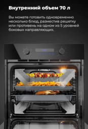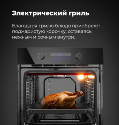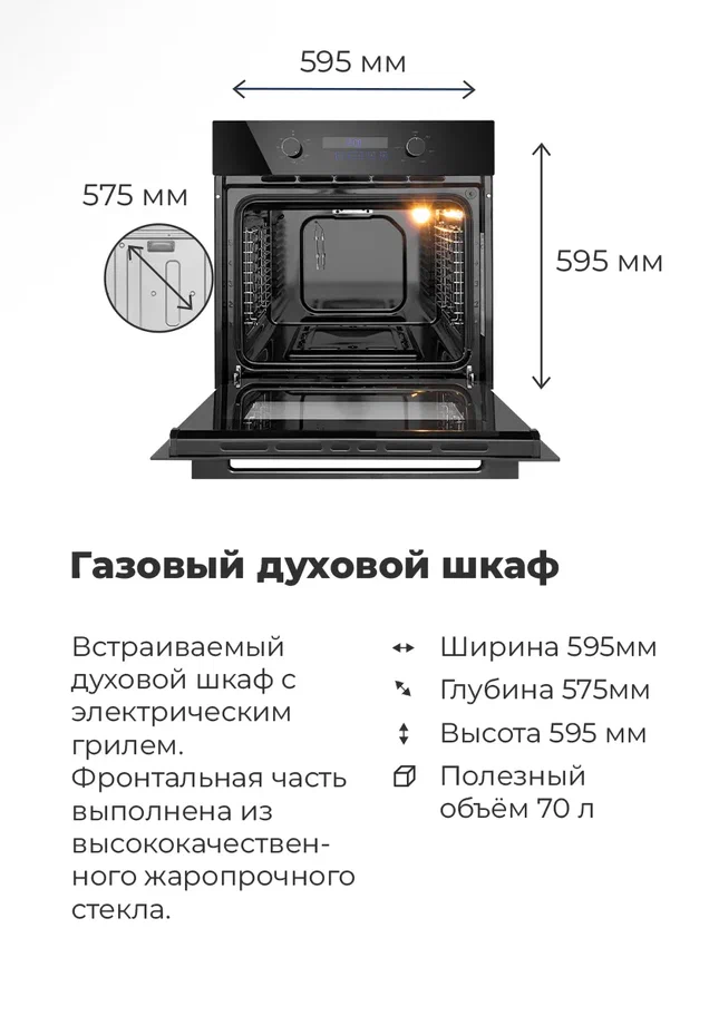 Стильный газовый встраиваемый духовой шкаф высокого качества сборки, актуального дизайна. Объем 70 л при стандартной ширине 60 см позволяет готовить одновременно несколько блюд, разместив решетку или противень на одном из 5-ти уровней боковых направляющих. Внутреннее покрытие камеры выполнено из специальной легкоочищающейся эмали черного цвета. Фронтальная панель дверцы, лицевая часть блока управления сделаны из высококачественного жаропрочного стекла белого цвета, окрашенного по всему объему, что является отличительной чертой бытового прибора премиум-класса. Комбинированное управление реализовано в виде сенсорного дисплея с подсветкой и поворотных ручек. Можно выбрать режим работы, температуру (160-265℃), установить таймер. В данной модели есть 3 режима работы: нижний нагрев, электрический гриль, освещение. Данная модель работает как при открытом, так и при закрытом гриле. Дверца состоит из 2-х жаростойких стекол. Благодаря подобной конструкции образовывается холодный фронт, что делает процесс приготовления безопасным, исключая возможность ожога при касании. Надежность духового шкафа обеспечивается полным газ-контролем – система, которая перекрывает подачу газа, если потух огонь. Автоматический электроподжиг является дополнительным преимуществом этой модели. Трамп-линии нанесены на внутреннем стекле для создания визуального эффекта непрозрачности фасада: при выключенном освещении не видно посуду, находящуюся внутри духовой камеры, а при включенном освещении можно в деталях рассмотреть весь процесс готовки. В комплекте: стандартный противень - 1 шт., универсальная решётка - 1 шт.; дополнительный жиклёр для природного газа - 1 шт.; 5-ти уровневые направляющие.