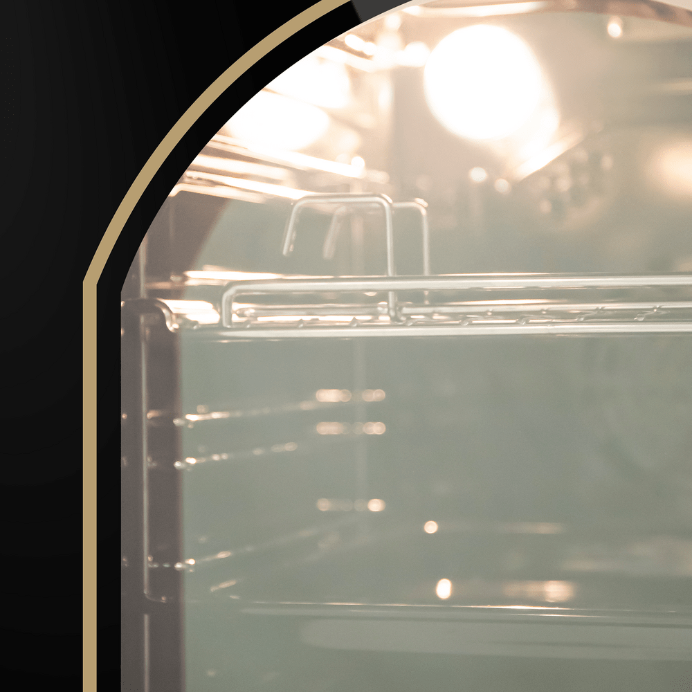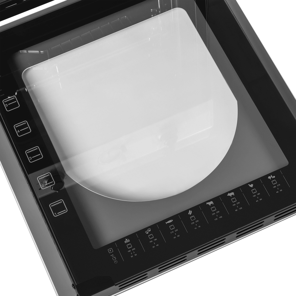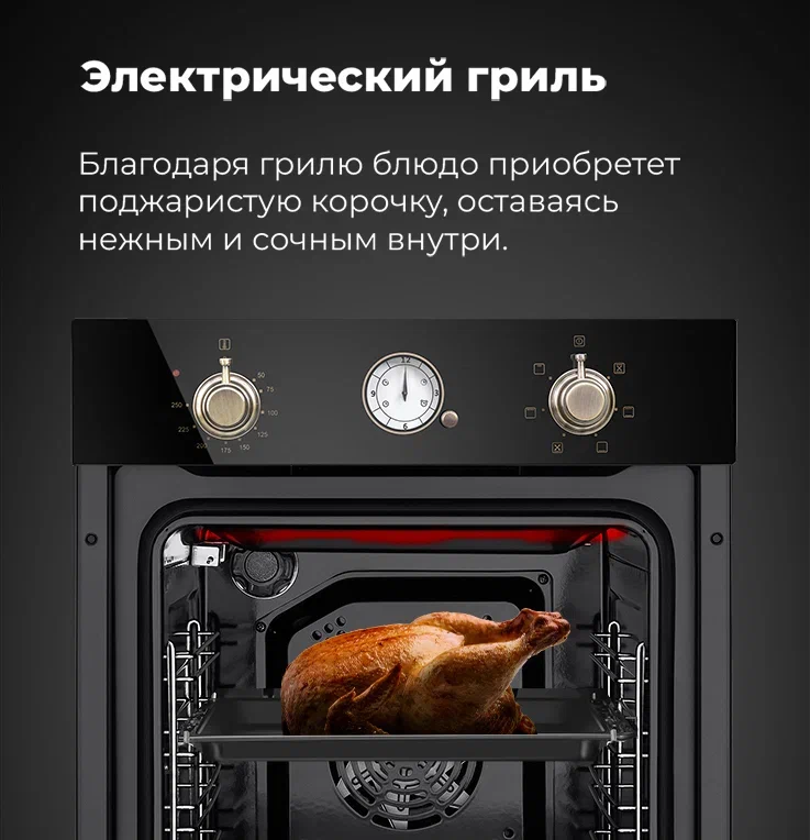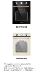 Компактный электрический встраиваемый духовой шкаф объемом 51 л и шириной всего 45 см позволяет готовить ваши любимые блюда, разместив решетку или противень на одном из 5 уровней боковых направляющих. Внутреннее покрытие камеры выполнено из специальной легкоочищающейся эмали черного цвета. Дверца духового шкафа состоит из 2-х стекол, что создает холодный фронт и делает процесс приготовления безопасным, исключая возможность ожога при касании. Фронтальная панель духовки сделана из высококачественного жаропрочного тонированного стекла белого цвета. Цельнометаллическая ручка дверцы остается холодной в процессе готовки. Механическое управление осуществляется цельнометаллическими поворотными ручками в ретро стиле. Можно выставить температуру готовки, установить таймер (0-55 мин) и выбрать один из 7 режимов работы: верхний + нижний нагрев, полный гриль, гриль, конвекция с нижним нагревом, конвекция с верхним и нижним нагревом/интенсивная выпечка, нижний нагрев, освещение. В комплекте: противень, хромированная решетка.