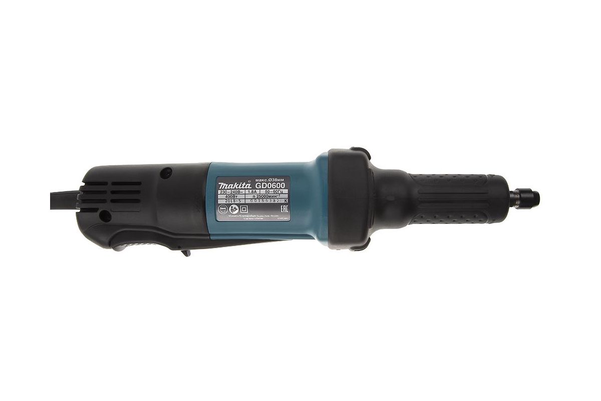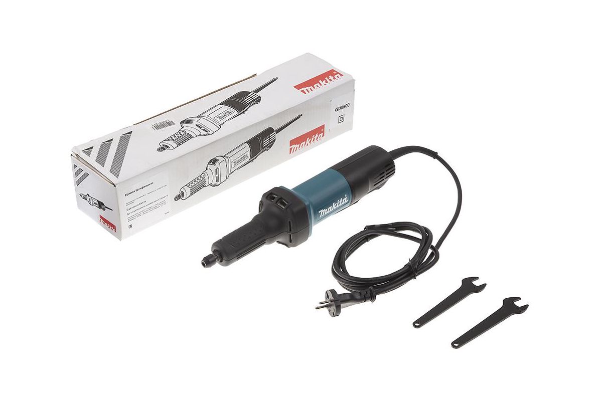 MAKITA GD0600 – прямая шлифовальная машинка. Оборудована двигателем на 400 Вт. Развивает скорость до 25000 об/мин. Подходит для обработки внутренних отверстий. Справится со шлифовкой заготовок из чёрных металлов. Поможет удалить заусенцы, лако-красочные покрытия и т.д.