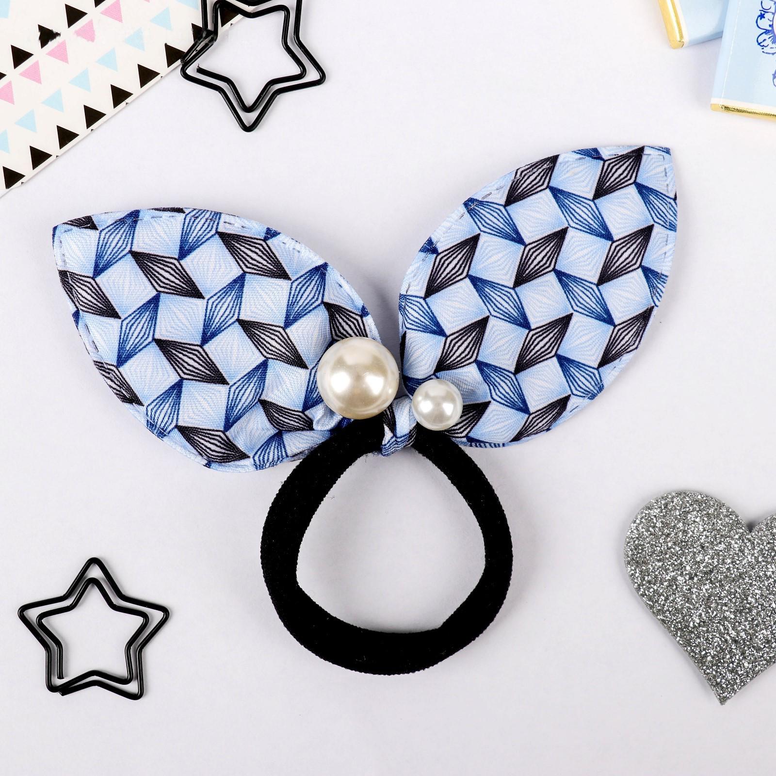 Резинка для волос "Ушки с бусинками" ромбики, 7 см, синий