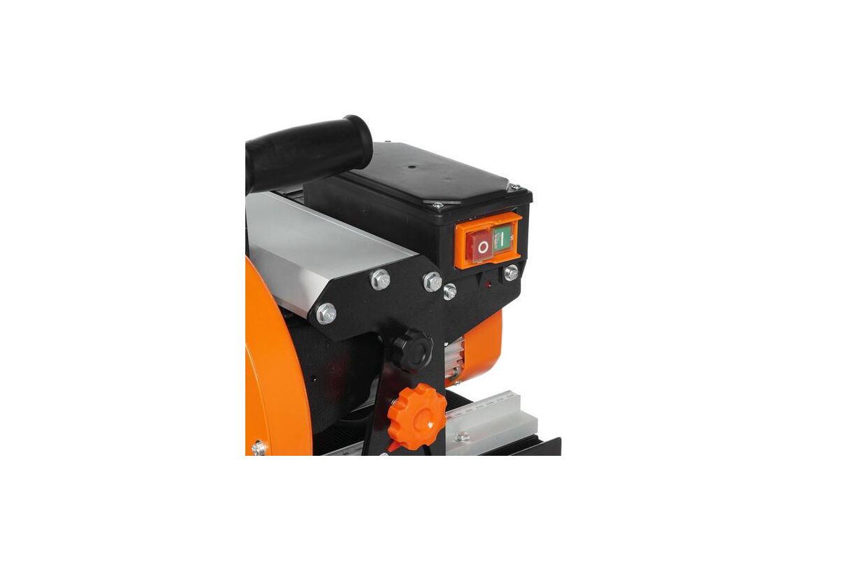 - Пильный диск закрыт кожухом, что снижает риск травматизма оператора в процессе работы с электрическим плиткорезом;