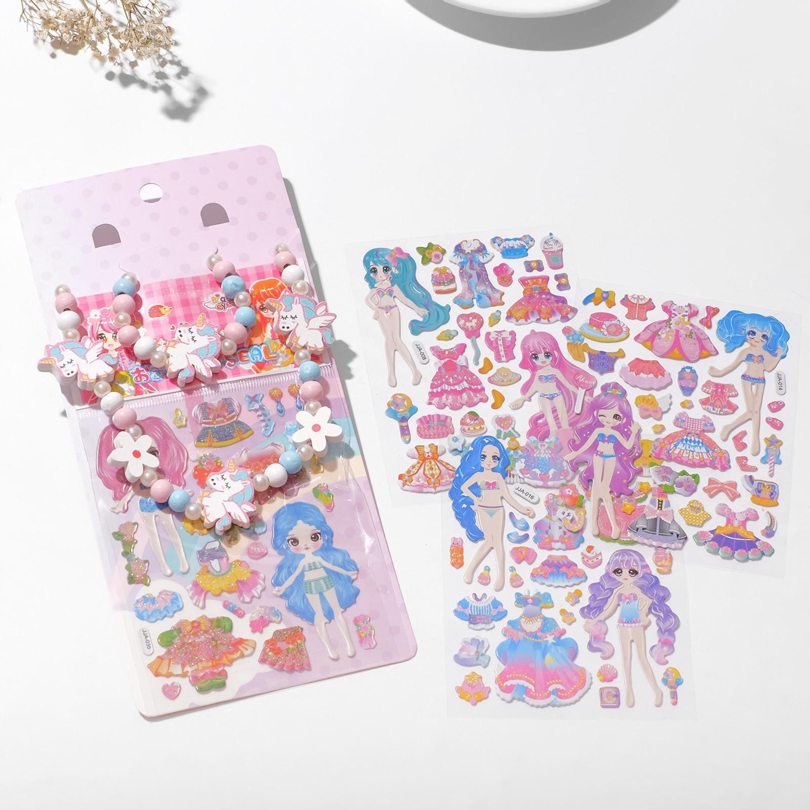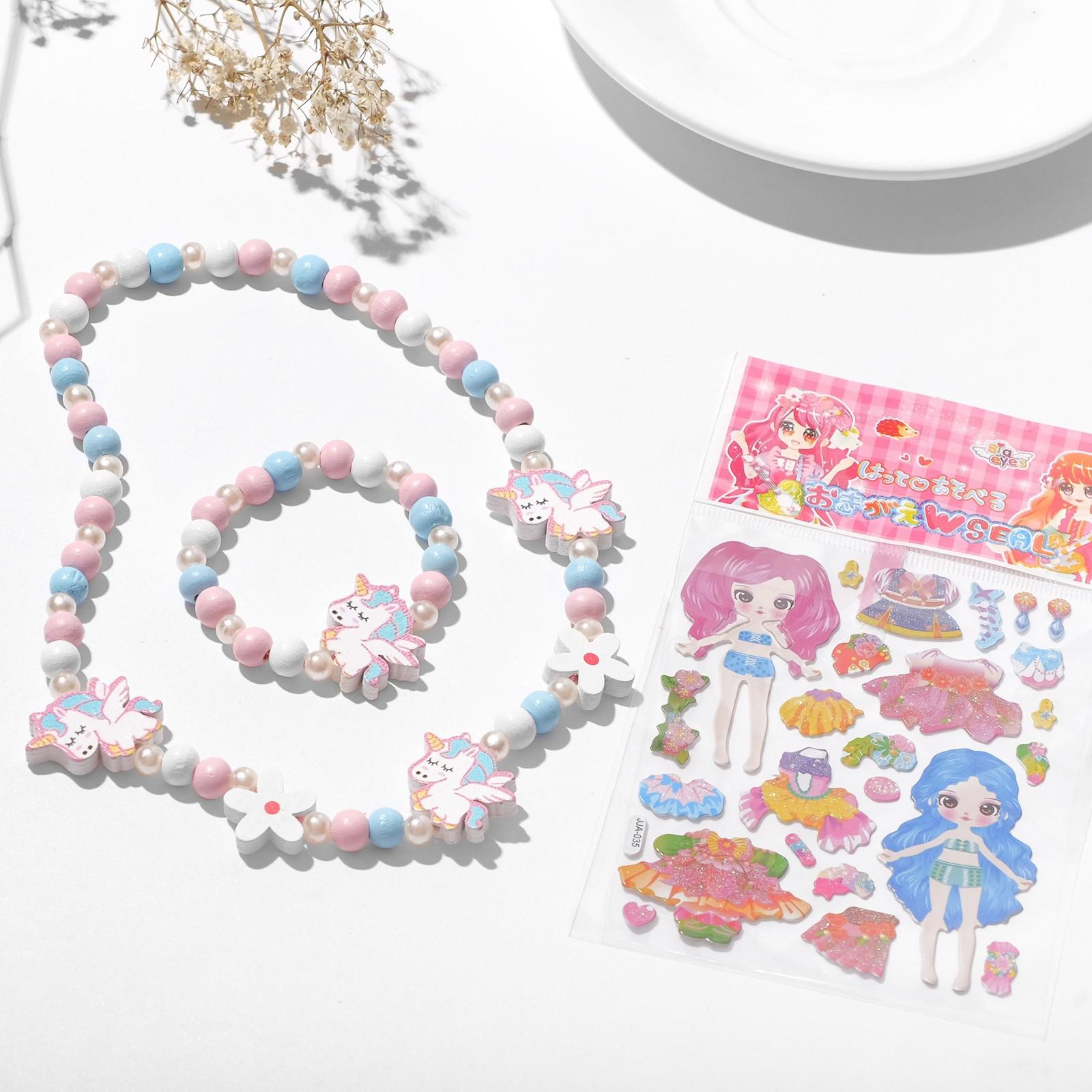 Набор детский "Выбражулька" 3 предмета: бусы, браслет, наклейки, девочки и единорожки, цвет МИКС