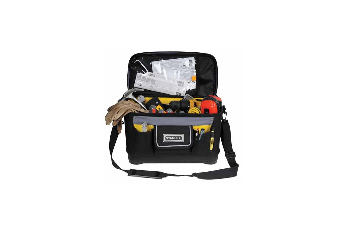 STANLEY Rigid Multipurpose 1-96-193 — надежная сумка для хранения и транспортировки различного ручного и электроинструмента (от гвоздей до шуруповерта или дрели). Застегивается на молнию. Имеет одно большое отделение и большое количество внутренних и внешних карманов. Размеры – 450х260х250 мм. Модель характеризуется высоким качеством материалов и удобством при переноске. Водоотталкивающее дно не позволит содержимому намокнуть.
