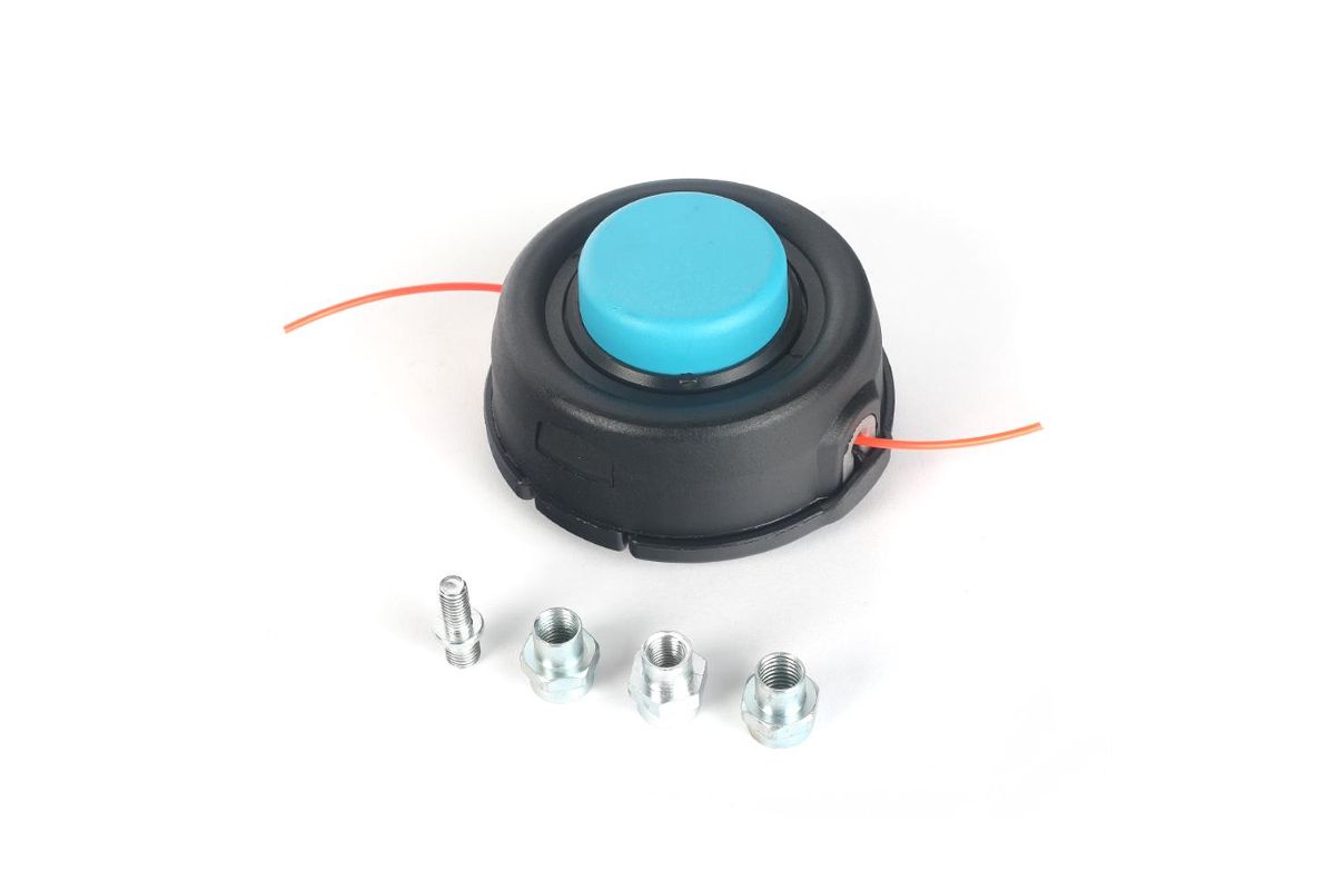 Универсальная полуавтоматическая катушка с комплектом адаптеров - M12x1,75L;M10x1,25L;M10x1.0L;M8x1,25L; Диаметр лески 2.0-3.0мм; Подходит для большинства моделей электро и бензо триммеров;