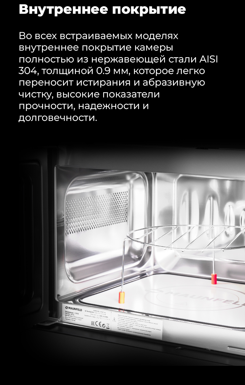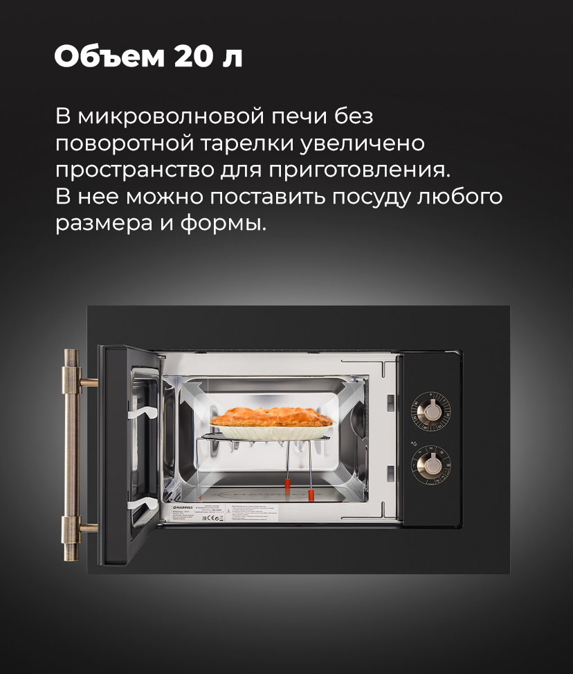 Больше пространства для приготовления. В микроволновой печи без поворотной тарелки увеличено пространство для приготовления. В нее можно поставить посуду любого размера и формы. Микроволновые печи Maunfeld без поворотной тарелки имеют магнетрон TOSHIBA, расположенный снизу (технология Round Flat). Это обеспечивает равномерный прогрев и сокращает время приготовления на 13%. Нержавеющая сталь не теряет своих свойств и прочности из за нагрева или температурных перепадов, легко моется и не покрывается жиром. Функция гриля помогает запекать еду до хрустящей корочки. Прекрасно подходит для приготовления пиццы. Автоматические программы+ COMBI. Это оптимально рассчитанные по времени и температуре режимы приготовления. Комби режимы включают в себя микроволны и гриль. В комплекте: решетка и сетевой шнур с вилкой.