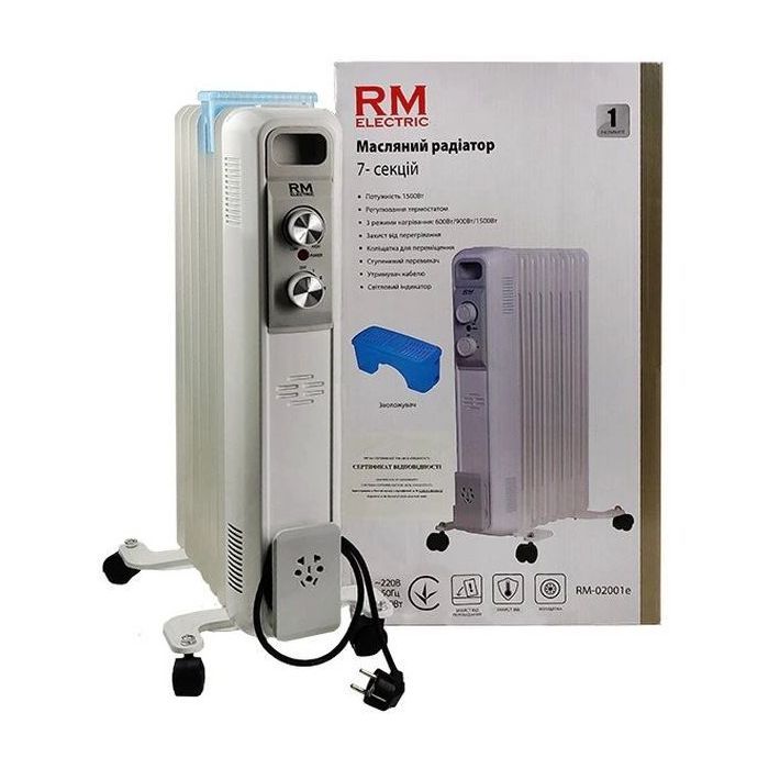 Масляний радіатор RM Electric, 7 секцій, 1500 Вт, 15 м2, 3 режими роботи, додатково зволожувач. Масляний радіатор RM02001e 1500 Вт - надійний і простий в управлінні радіатор масляний з 7 модулями. Призначений для додаткового обігріву та підтримки оптимальної температури в житлових та офісних приміщень. Завдяки великій потужності легко обігріє приміщення 15-20м.кв. і підтримуватиме потрібну температуру. Комплектується ємністю для зволоження повітря.
