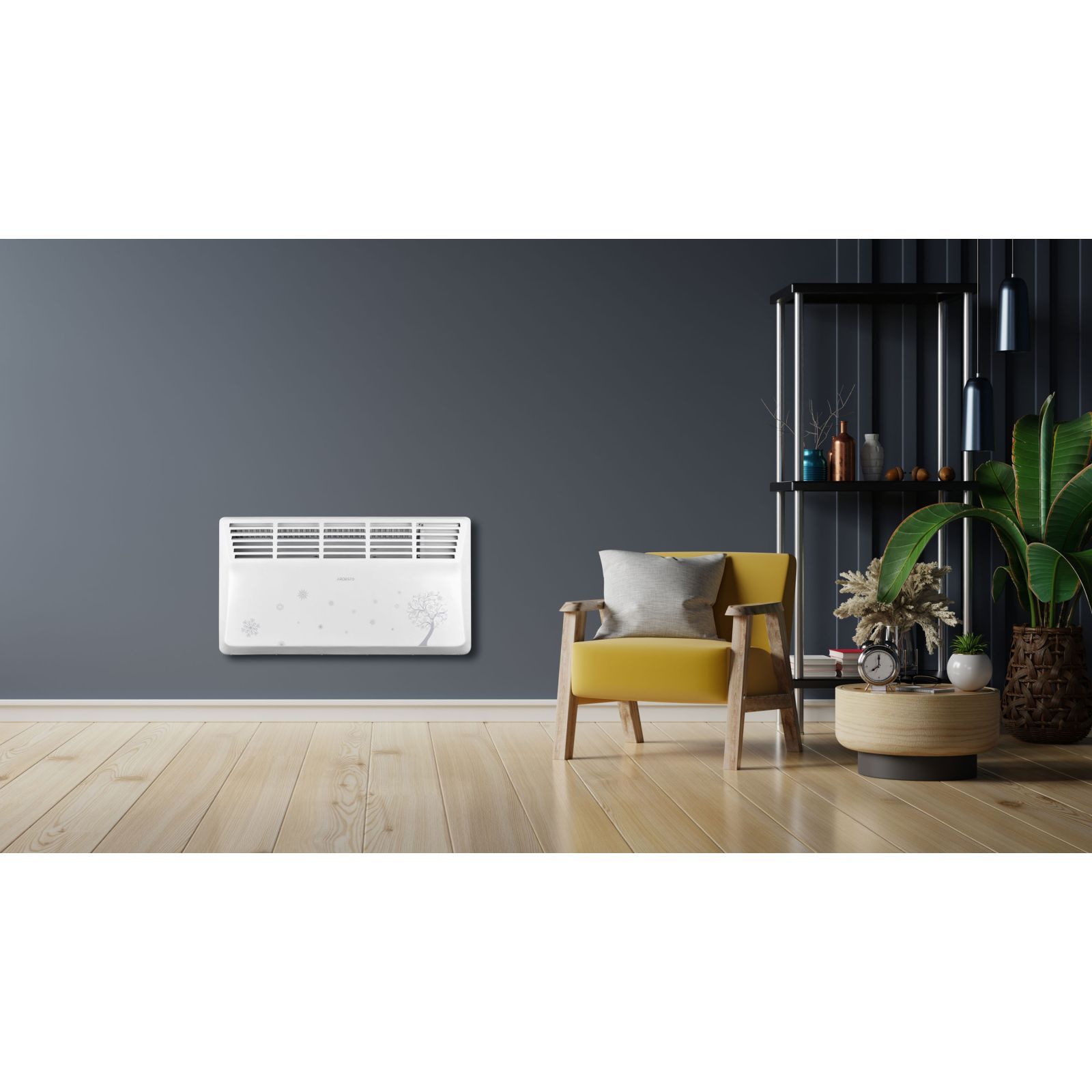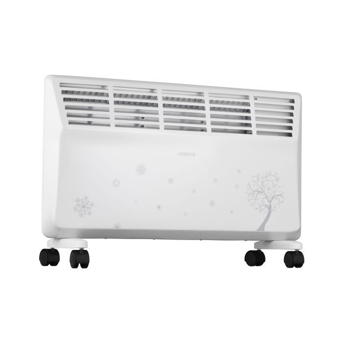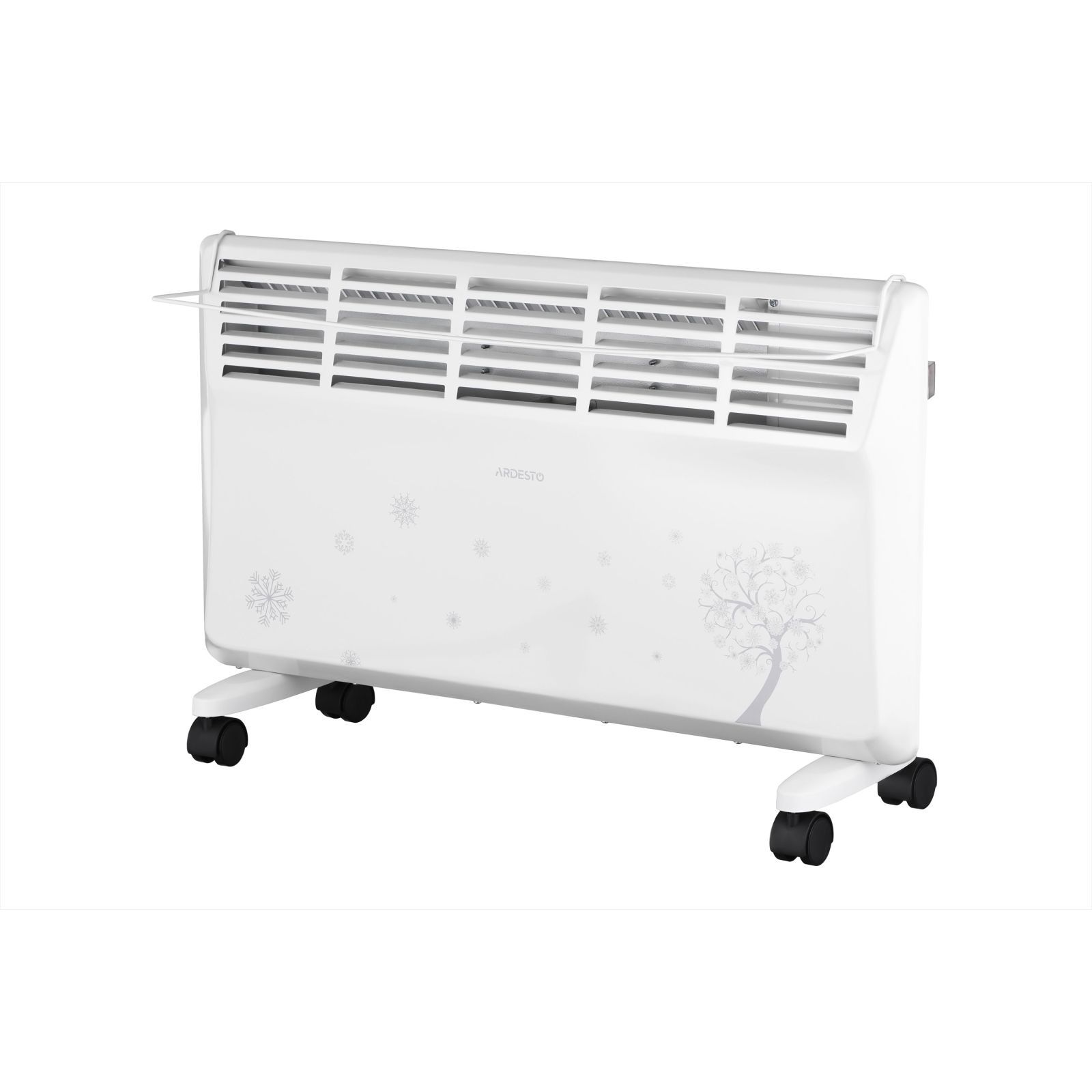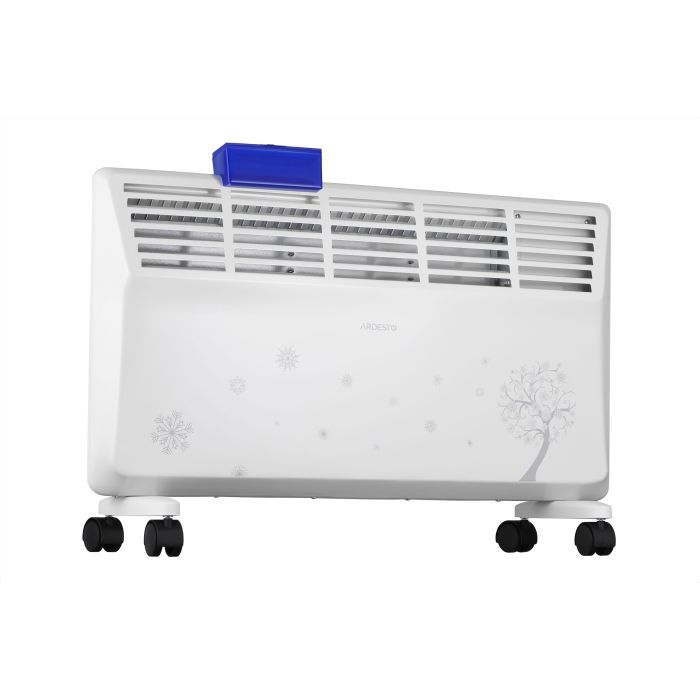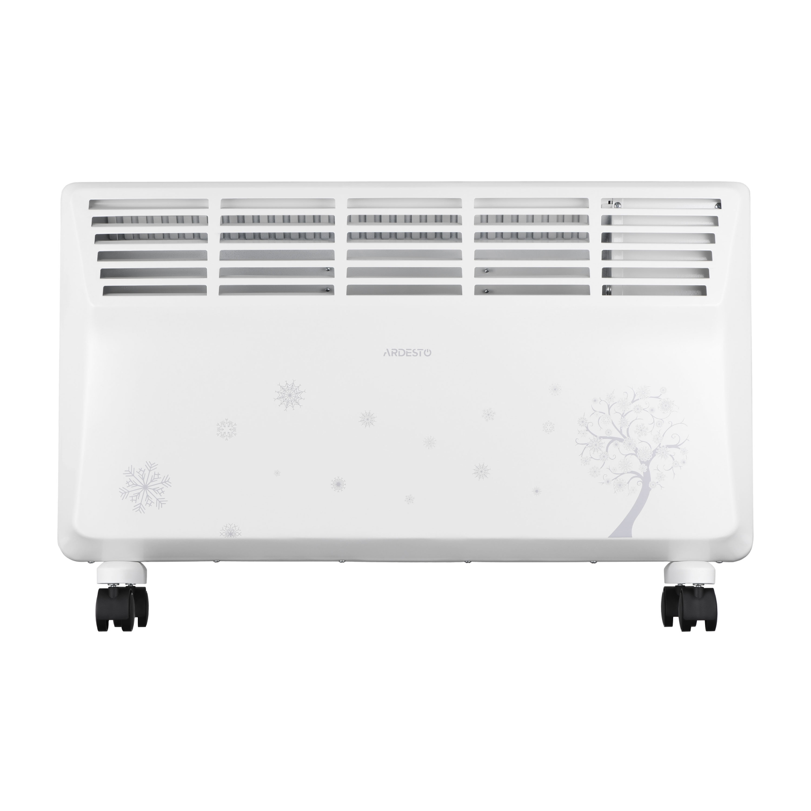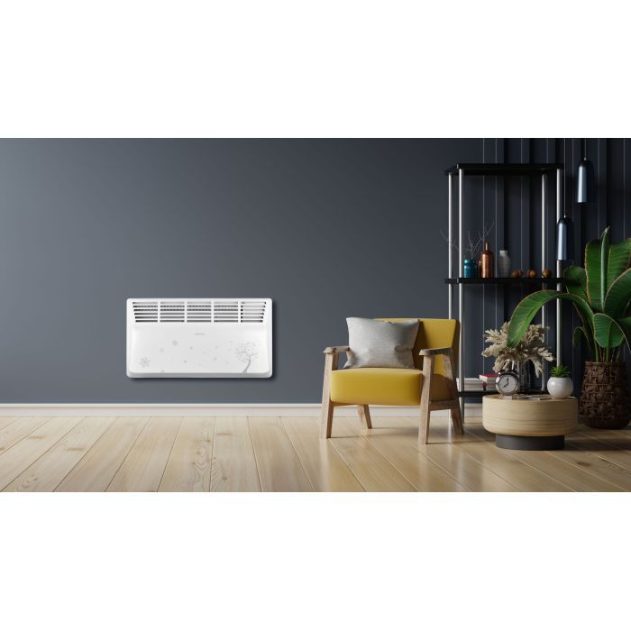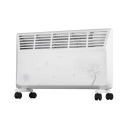 Електричний конвектор з механічним керуванням білого кольору із стильним візерунком, класом захисту IP20 та двома режимами потужності 1000/2000 Вт. Розрахований на обігрів приміщень площею 20 м2. Клас енергозахисту – перший. У цій моделі передбачено сушіння та контейнер для природного зволоження повітря. Є захист від перегріву та датчик від перекидання. Ця модель обігрівача має два типи монтажу – настінний та підлоговий. Кронштейни та опори з коліщатками для установки для підлоги поставляються в комплекті з обігрівачем.