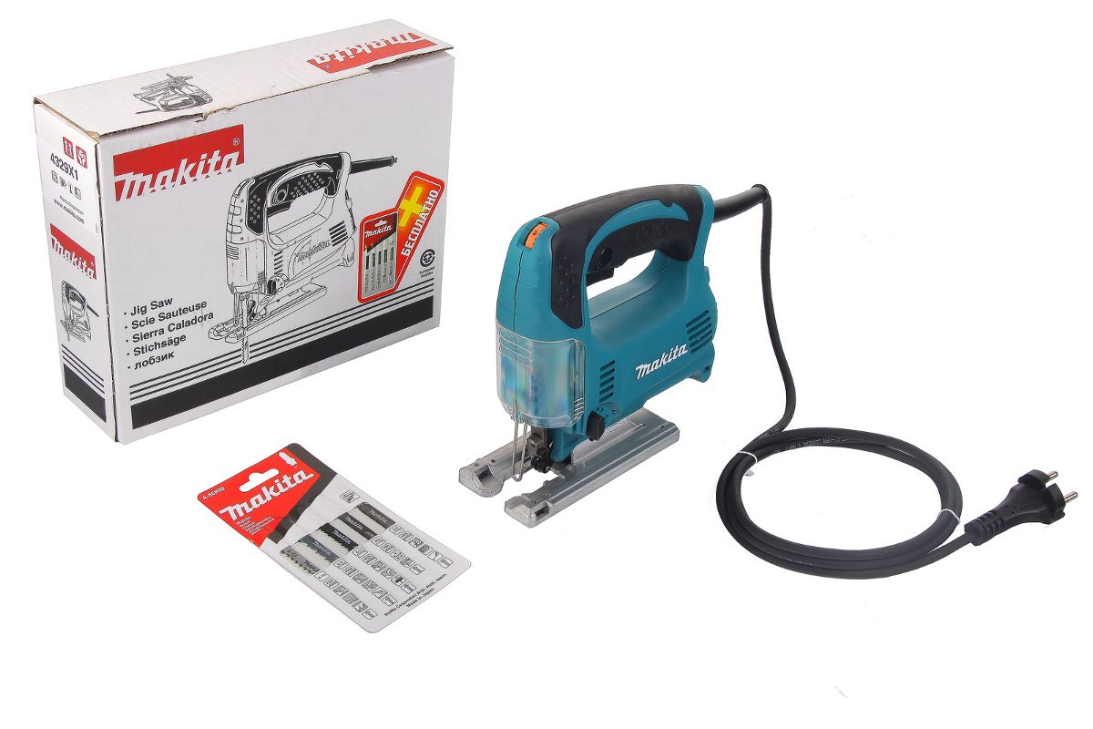MAKITA 4329X1 – удобный лобзик для прямых, угловых и фигурных пропилов в дереве и других материалах, в том числе у края заготовки. Облегченная модель с низким уровнем вибрации и шума. Инструмент обладает массой достоинств – регулировкой скорости хода пилки (500-3100 об/мин), удобной прорезиненной рукояткой, защитой от перегрузок и проч.