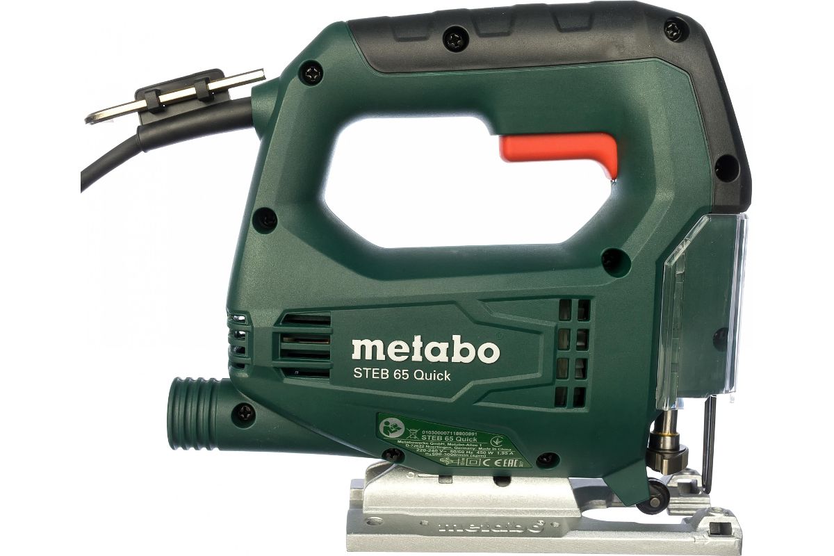 Лобзик Metabo STEB 65 Quick 601030500 имеет 4 ступени маятникового хода. Благодаря системе Metabo ''Quick'' смена пильного полотна не занимает много времени и дополнительных приспособлений не требуется. Функция выдувания обеспечивает хороший обзор области реза. Скорость резания легко и просто настраивается поворотом специального колесика.