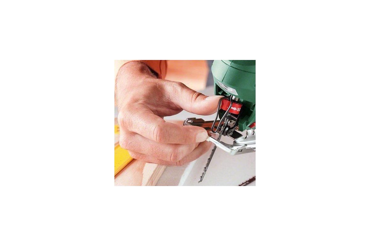 Оснастка меняется без применения ключа. Для этого используйте фиксатор, расположенный на штоке лобзика.