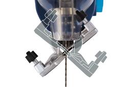 Уровень безопасности лобзика повышен благодаря многоступенчатой функции маятникового хода, скорость резки достаточно высока, а движения полотна при работе с материалом поступательно-возвратные и маятниковые. Поэтому из-за данного вида пропила получается правильное и равномерное распределение давления буквально по всей поверхности разрезаемого материала. Отсюда и высокий показатель производительности, и так необходимая для мастера точность во время выполнения фигурного реза. В инструменте регулируется угол наклона рабочей подошвы. Эта функция намного увеличивает область применения электролобзика. Пилка вставляется в быстрозажимной патрон.