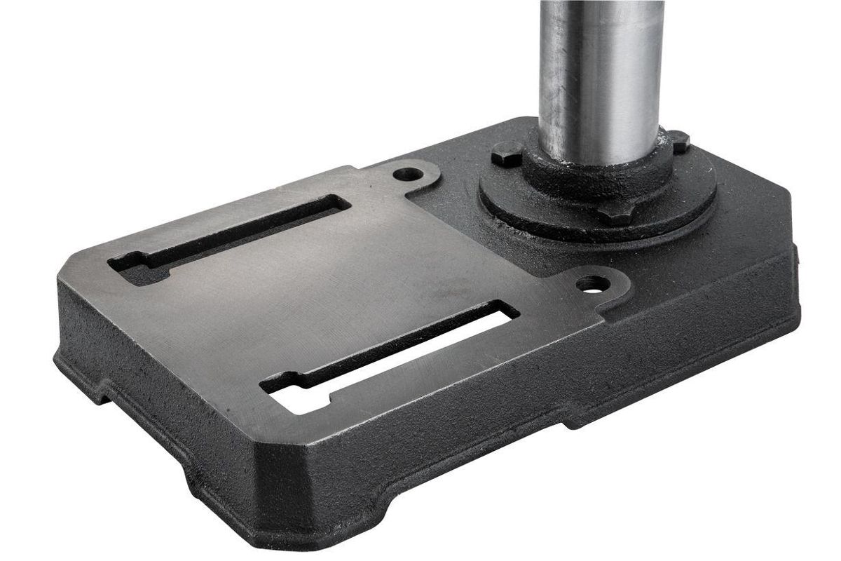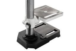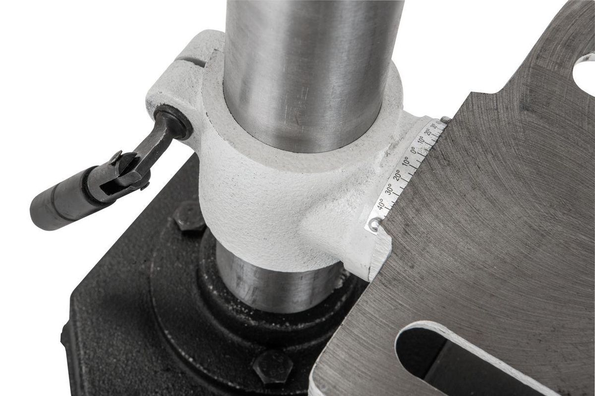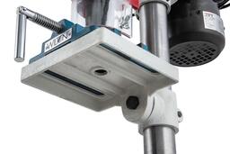 - Пиноль шпинделя оборудована резьбовым упором-ограничителем, это простой в настройке и точный механизм, позволяющий производить установки с помощью штангенциркуля, или просто отсчитывая обороты гайки. Заготовку размещают на регулируемом чугунном столе. Он поворачивается вокруг горизонтальной оси, перемещается вверх и вниз по колонне, а если потребуется разместить крупную заготовку, может быть отведен в сторону разворотом на колонне. В таком случае опорой выступает верхняя поверхность подставки станка, отфрезерованная в плоскость, перпендикулярную оси сверления.