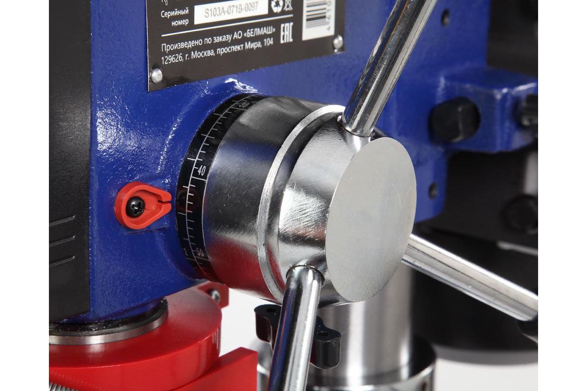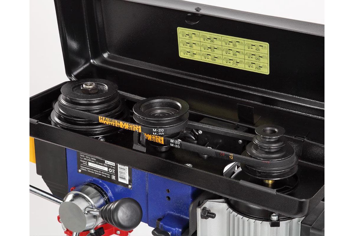 - Скорость вращения шпинделя переключается при помощи переброски ремня. Заготовку можно закрепить на рабочем столе или основании в зависимости от ее размеров. Шкала с левой стороны от выключателя указывает на ход пиноли шпинделя.