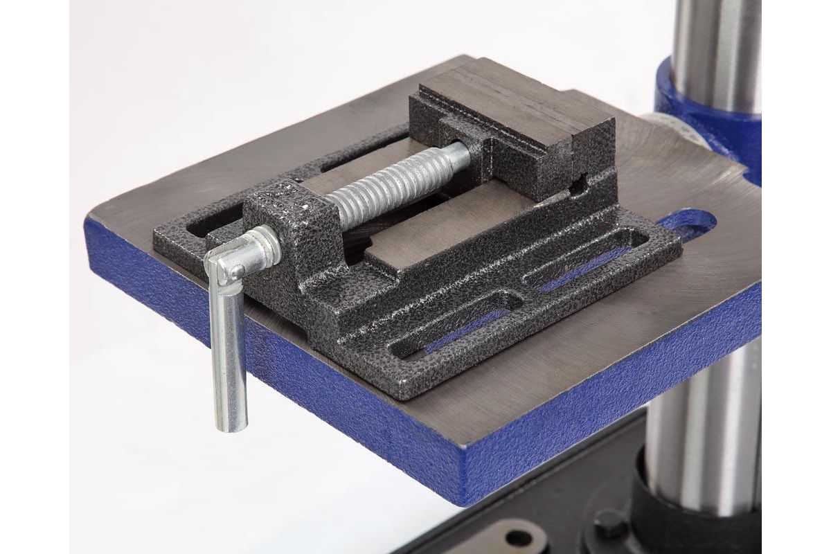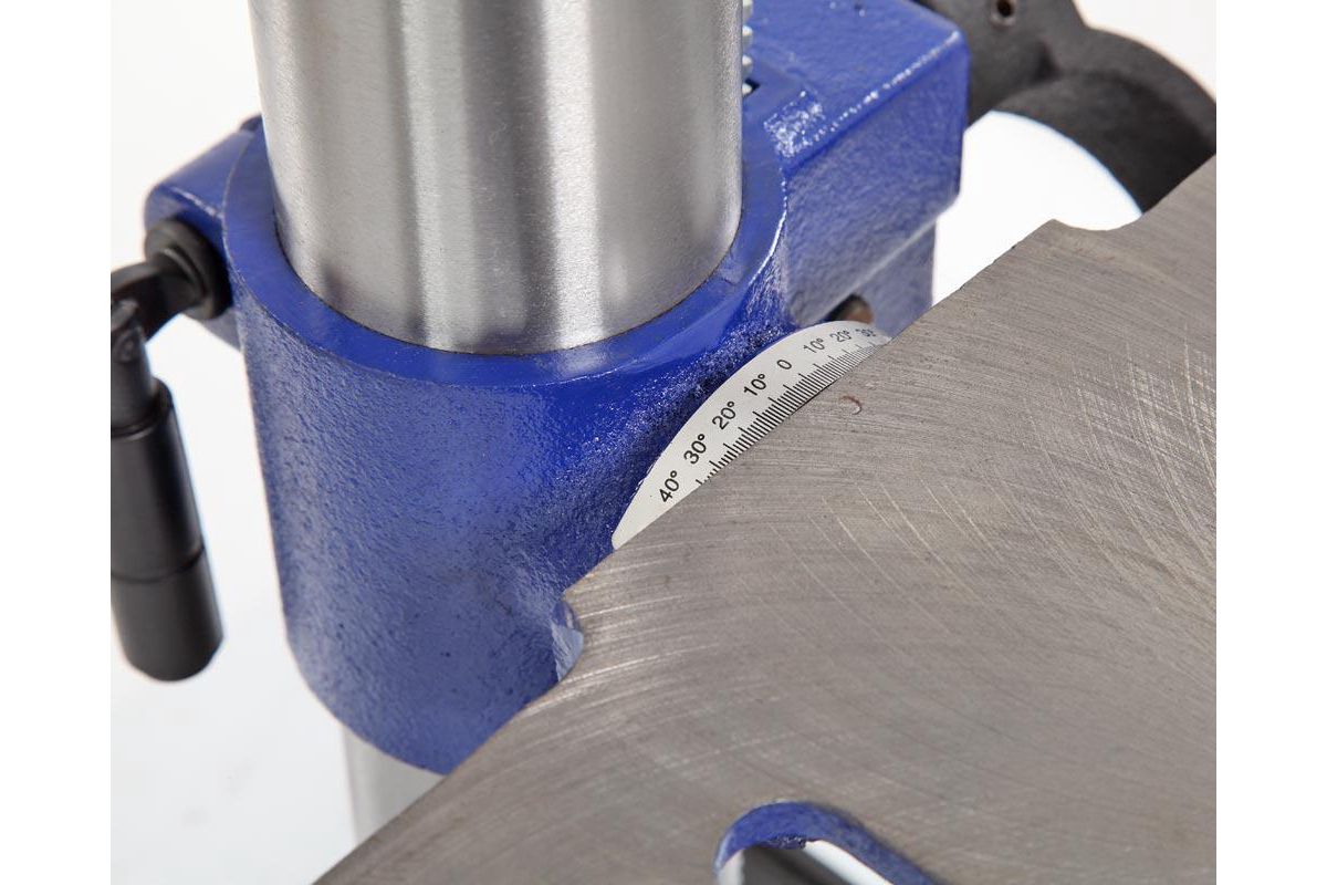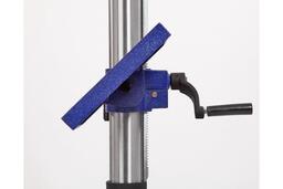 - На стойке находится зубчатая рейка, поднятие и опускание стола регулируется с помощью рукоятки. В опоре есть два монтажных отверстия для установки на верстак.