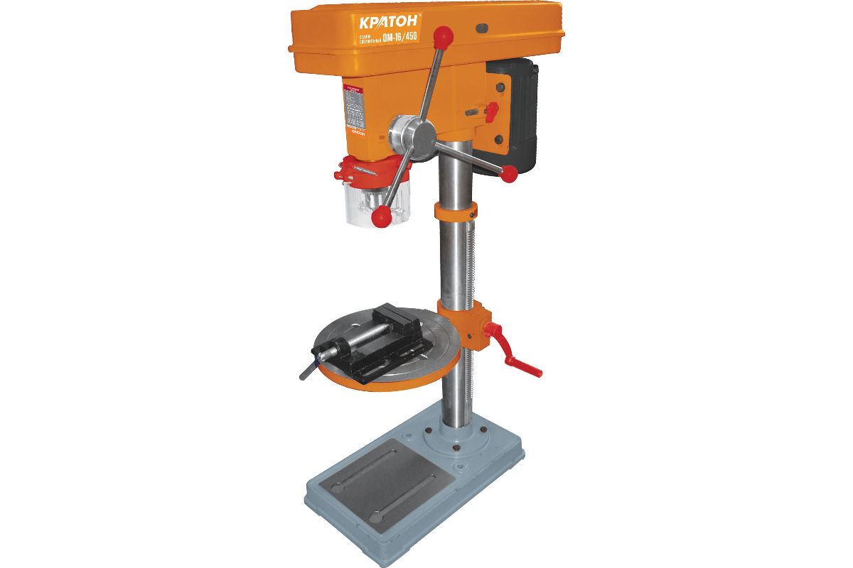Станок сверлильный КРАТОН DM-16/450 — универсальная настольная модель мощностью 450 Вт, подходящая для домашней мастерской. Благодаря ступенчатой регулировке оборотов можно адаптировать скорость в соответствии с материалом (всего 12 ступеней, в пределах 300-2550 об/мин). Устанавливается на верстак и комплектуется станочными тисками. Вес модели — 35 кг.