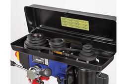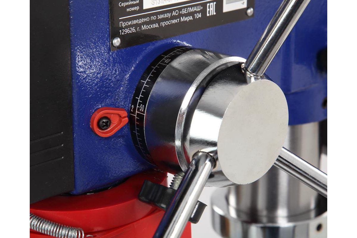 - Наклон стола регулируется от -45? до +45?, поднятие и опускание настраивается с помощью рукоятки. Для выполнения различных операций предусмотрено 12 ступеней скорости вращения шпинделя, переключение происходит за счет переброски ремней.