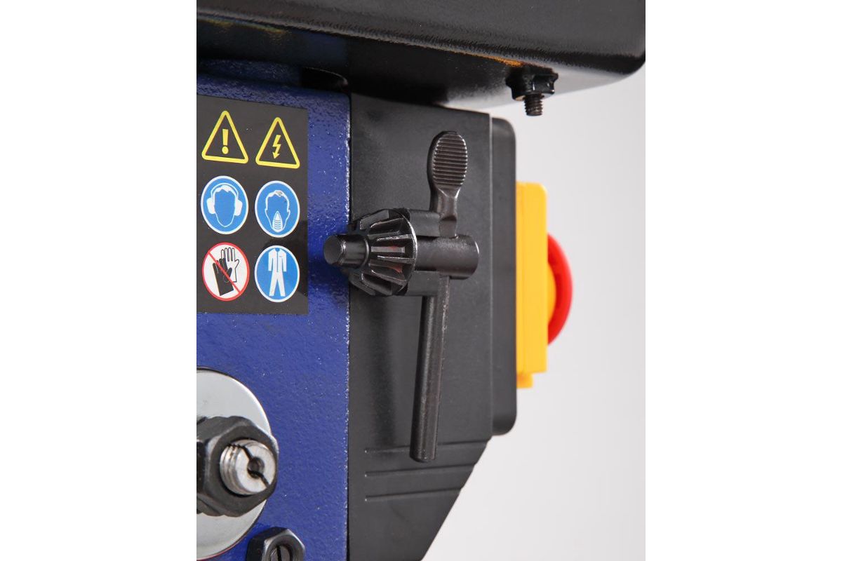 - Управление станком осуществляется двумя кнопками, выключатель снабжен защитной крышкой. Рабочий стол и основание оборудования оснащены пазами для крепления тисков (идут в комплекте).