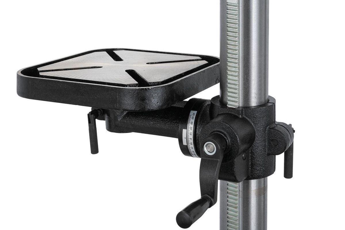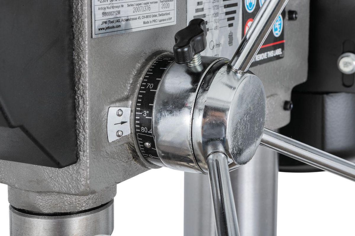 - Ход пиноли шпинделя составляет 80 мм. Для контроля глубины сверления предусмотрена шкала с миллиметровой и дюймовой разметкой, а также регулируемый ограничитель;