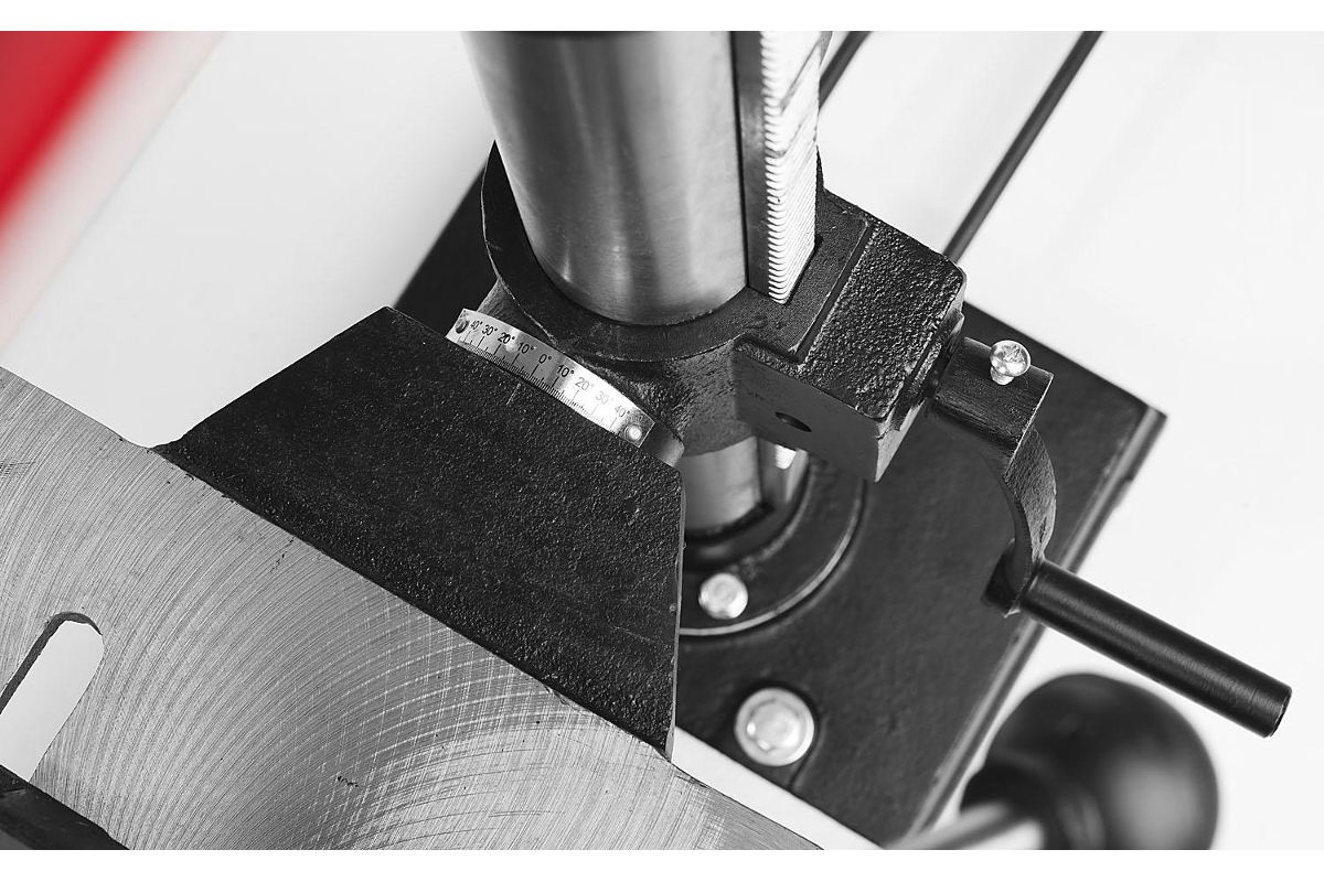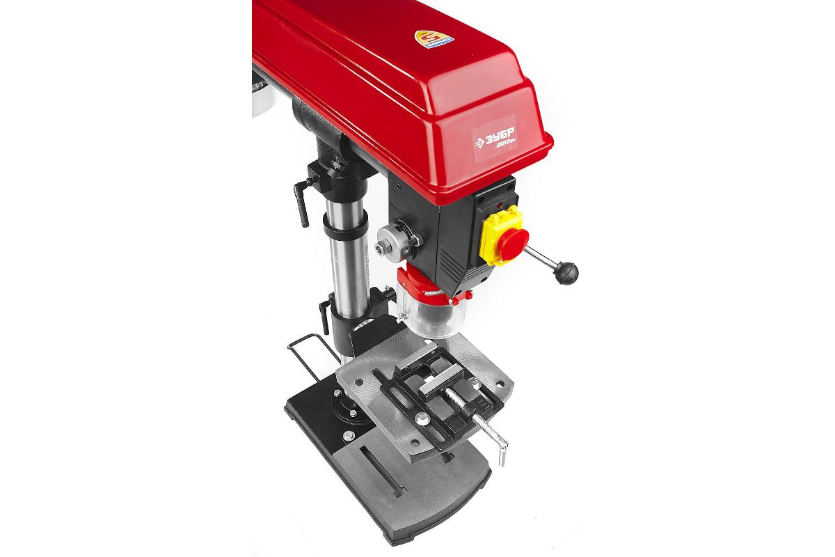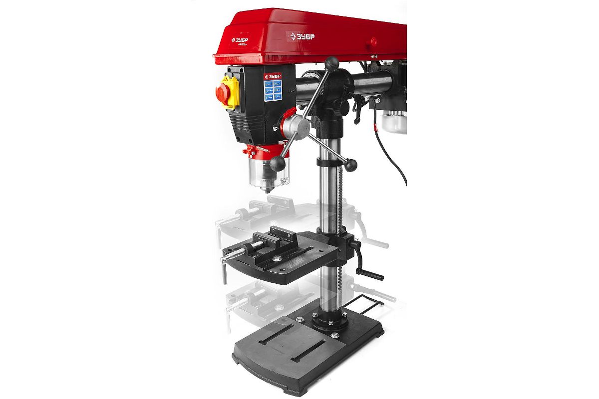 Сверлильный станок ЗУБР ЗСС-550 — функциональная настольная модель мощностью 550 Вт. Предназначается для неинтенсивного сверления в условиях домашней или частной мастерской. Ременная передача позволяет менять скорость вращения шпинделя (5-ступенчатая регулировка в диапазоне 470-3030 об/мин). Максимальный ход шпинделя — 100 миллиметров. Регулируя наклон сверлильной головки (0-45°), можно сверлить под заданным углом. Для безопасности оператора предусмотрен защитный кожух и кнопка экстренного выключения. Модель комплектуется тисками и весит 48 кг.
