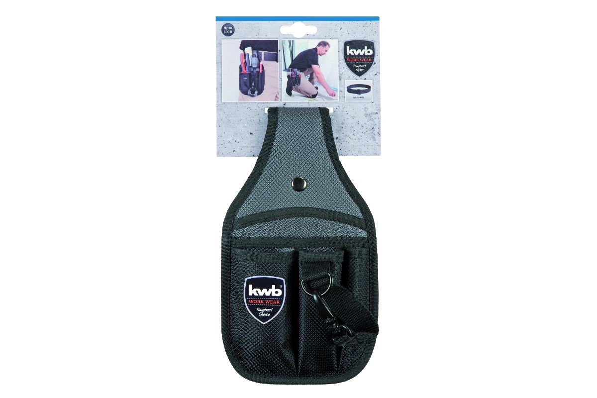 Инструментальная поясная сумка из нейлона чёрного/серебристого цвета, двойной шов, с контрастной серебристой нитью; для большей стабильности металлическая скоба прикреплена четырьмя заклёпками; высокая прочность; два больших и три маленьких отделения; пет