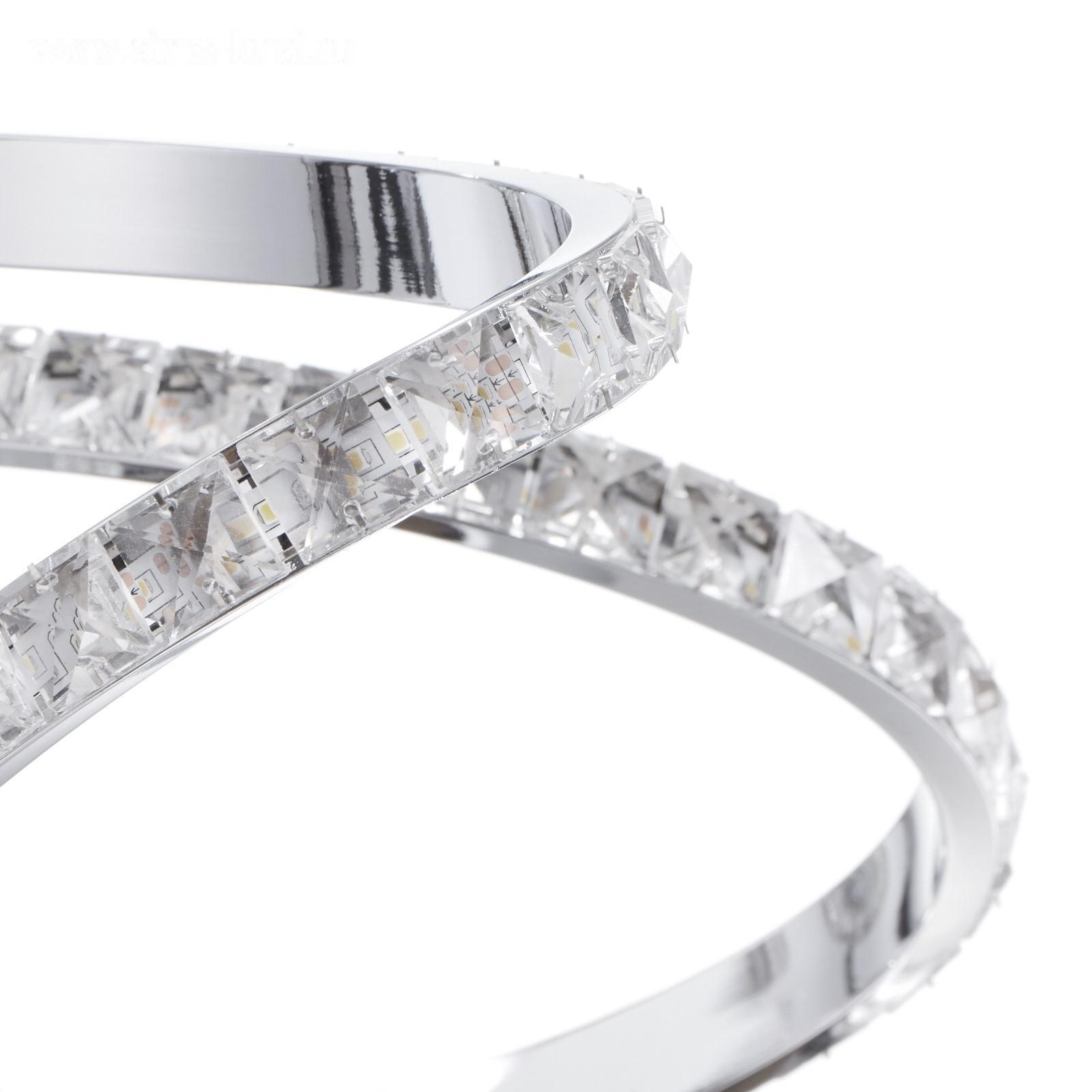 Изделие выполнено из качественного металла, стекла и светодиодов. Срок службы люстры в домашних условиях — 20 000 часов. Подходит для помещений с низкими потолками и для натяжных потолков. Осветит комнату площадью до 17 м².