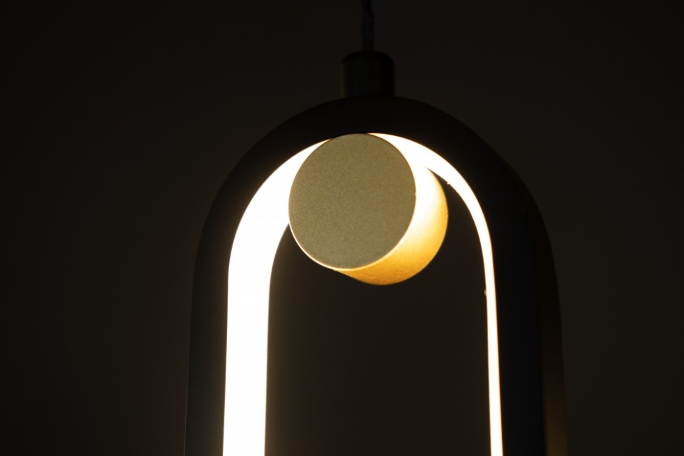 Современный подвесной светильник в черном цвете. Дарит мягкое рассеянное светодиодное свечение. Золотой элемент декора создает элегантный акцент. В серии также есть светильник в золотом цвете — вы сможете комбинировать их в интерьере, создавая яркие свежие композиции. Округлые формы дарят интерьеру гармонию и чувство завершенности.