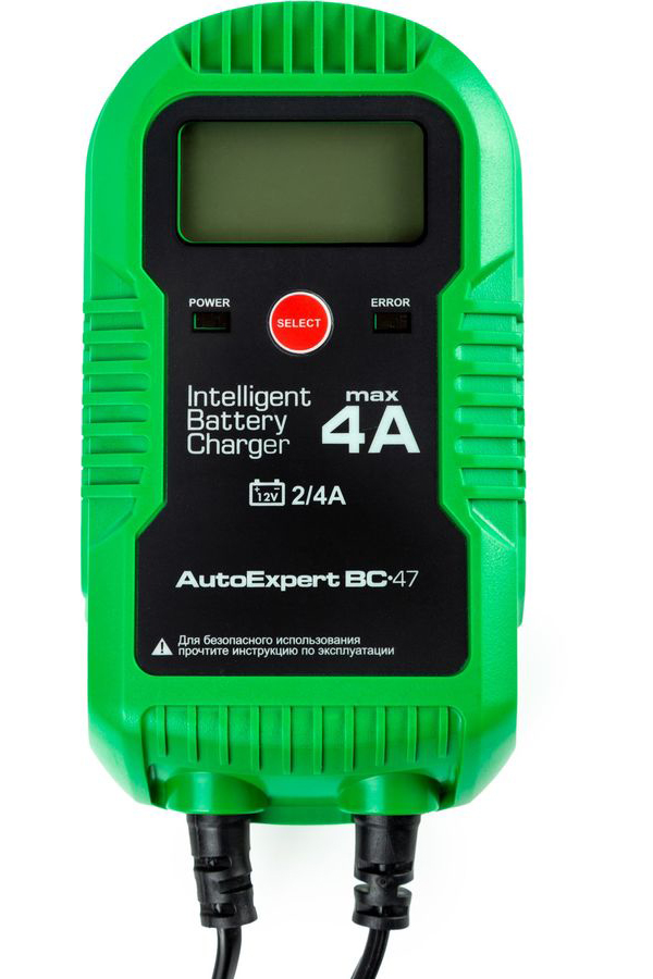 Автомобильное зарядное устройство AutoExpert BC-47 поможет вам восстановить работоспособность аккумулятора, который был разряжен. Модель предназначена для зарядки 12-вольтовых батарей. Преимуществом зарядного устройства является наличие дисплея. Процесс зарядки можно будет контролировать в полной мере. Зарядное устройство AutoExpert BC-47 характеризуется максимальным током зарядки, составляющим 4 А. Предусмотрены 3 режима работы – зарядка АКБ малой емкости (для мотоаккумуляторов), зарядка АКБ большой емкости и зарядка при низких температурах. Устройство соответствует классу IP65. Это значит, что ЗУ не только не подвержено проникновению пыли, но и защищено от воздействия струй воды. Также в наличии защита от короткого замыкания, от переполюсовки и от перегрузки. Процесс зарядки останавливается автоматически. Дополнительным преимуществом ЗУ является компактность. Цвет корпуса модели – зеленый. В комплектацию зарядного устройства входит документация.