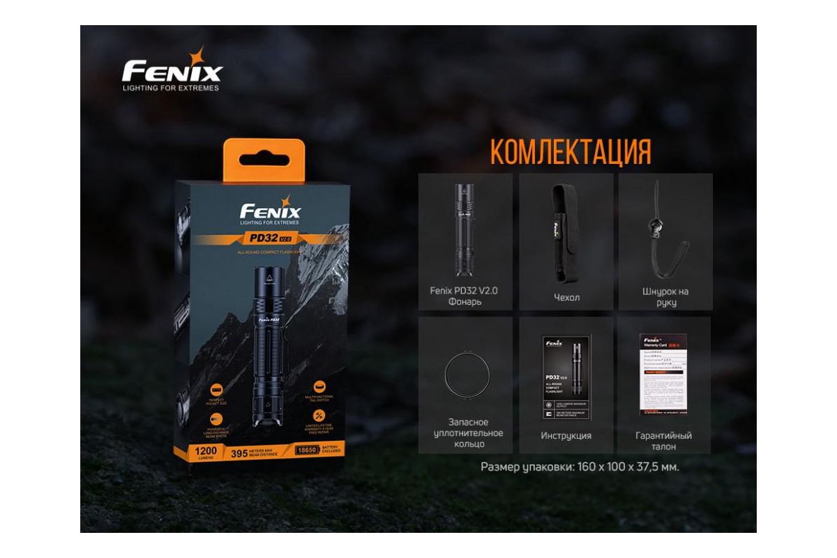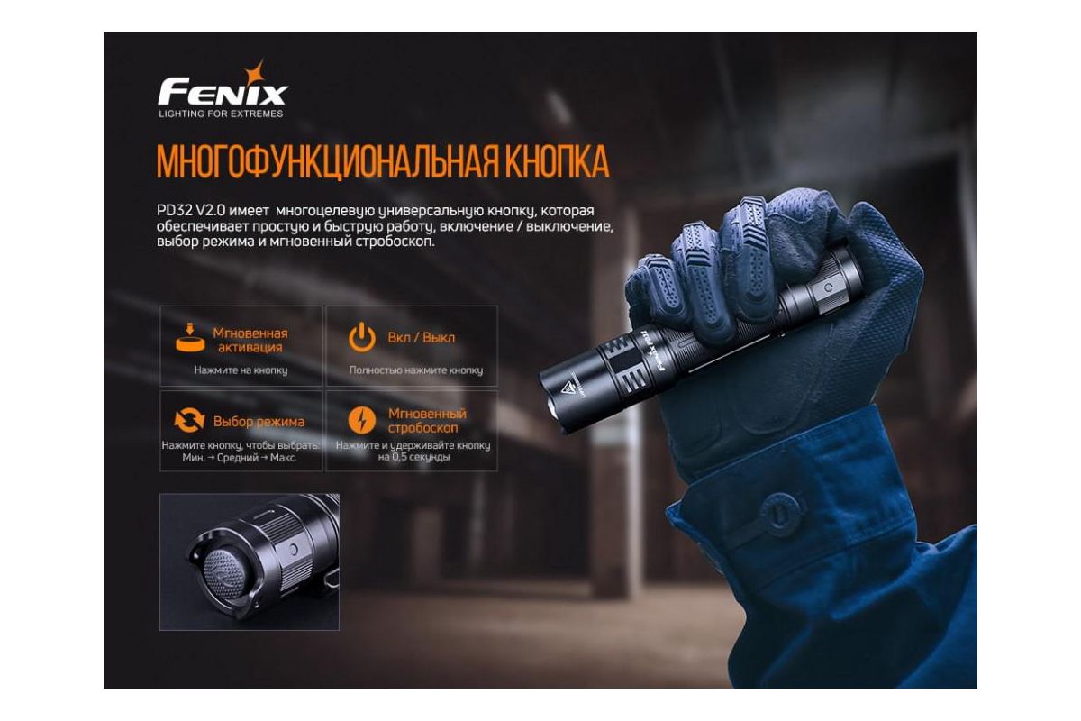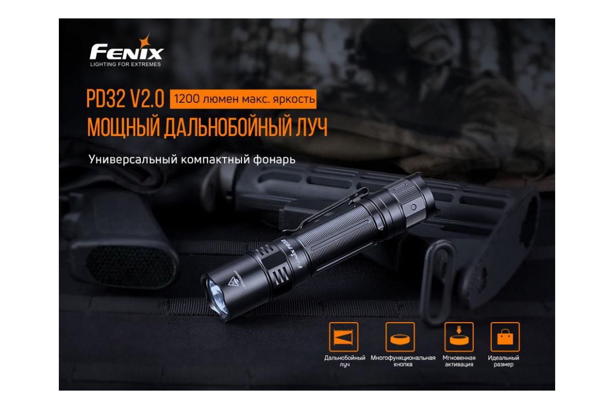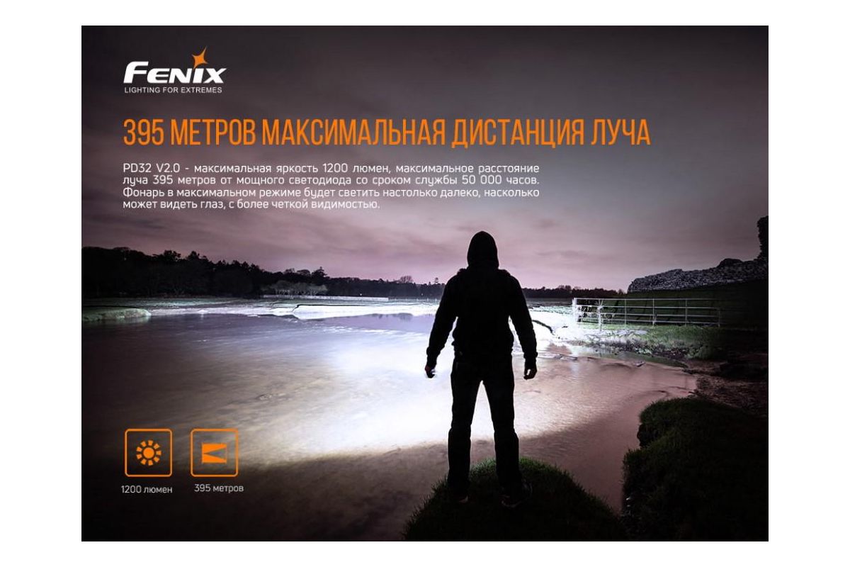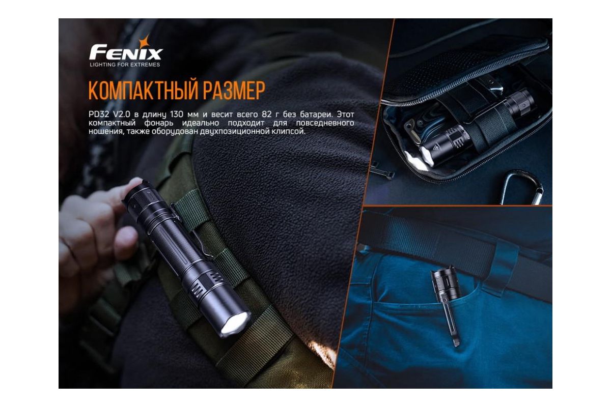 Усовершенствованная модель PD32 V2.0 - сочетание мощности, компактности, практичности и универсальности. Отличный вариант для EDC-использования за счет малого веса и небольших размеров. Он едва достигает 13 см в длину, имеет клипсу, за которую его можно удобно прикрепить на рюкзак, пояс или карман. Главное преимущество данной модификации - увеличение максимальной яркости света до 1200 люменов и дистанции луча до 395 метров.