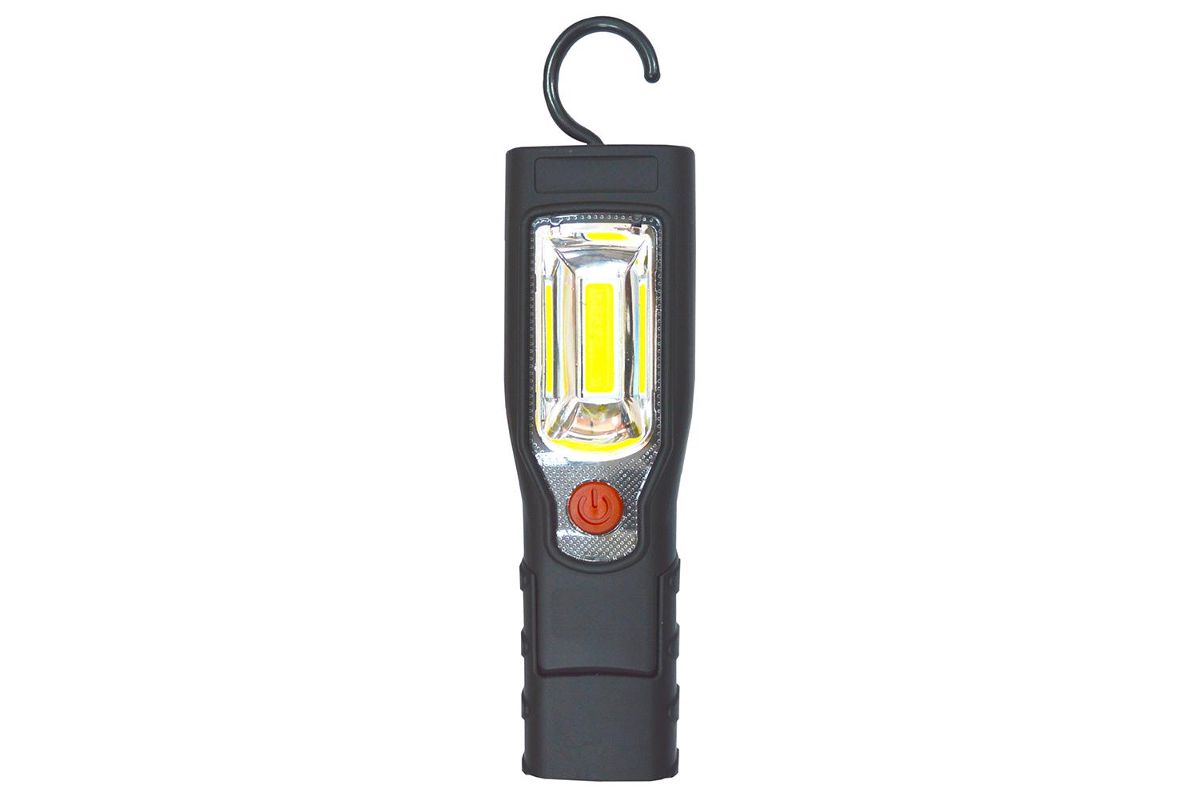 Светодиодный аккумуляторный фонарь с корпусом, защищающим от пыли и влаги. Оснащен двумя крючками.