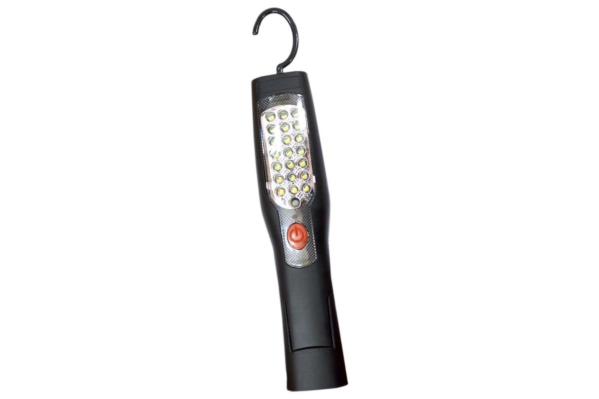 Светодиодный аккумуляторный фонарь с корпусом, защищающим от пыли и влаги. Оснащен двумя крючками.