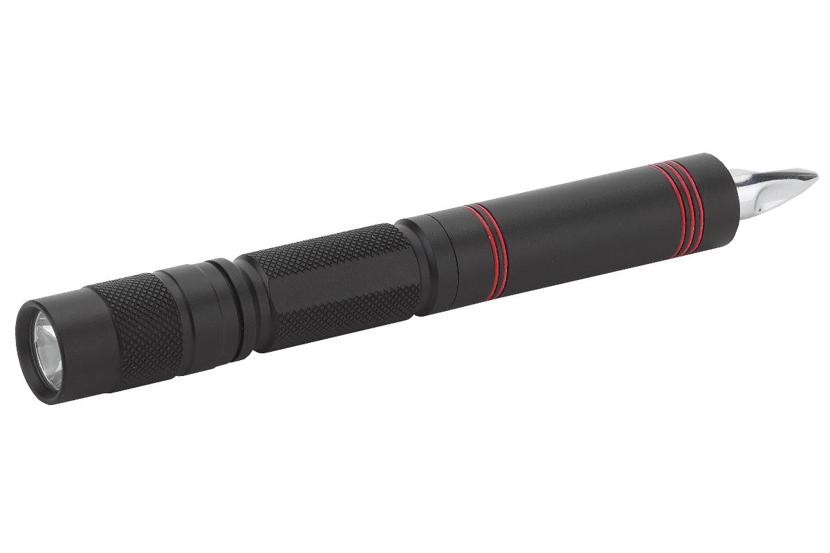 Универсальный фонарь имеет яркий светодиод мощностью 1,5 Вт. Изделие работает от одной обыкновенной батарейки (приобретается отдельно). В конструкции данной модели помимо функции освещения дополнительно заложены: молоток для стекла и нож длиной 4,5 см.