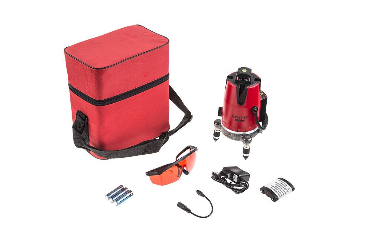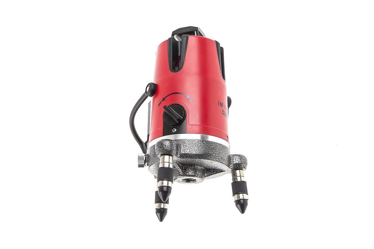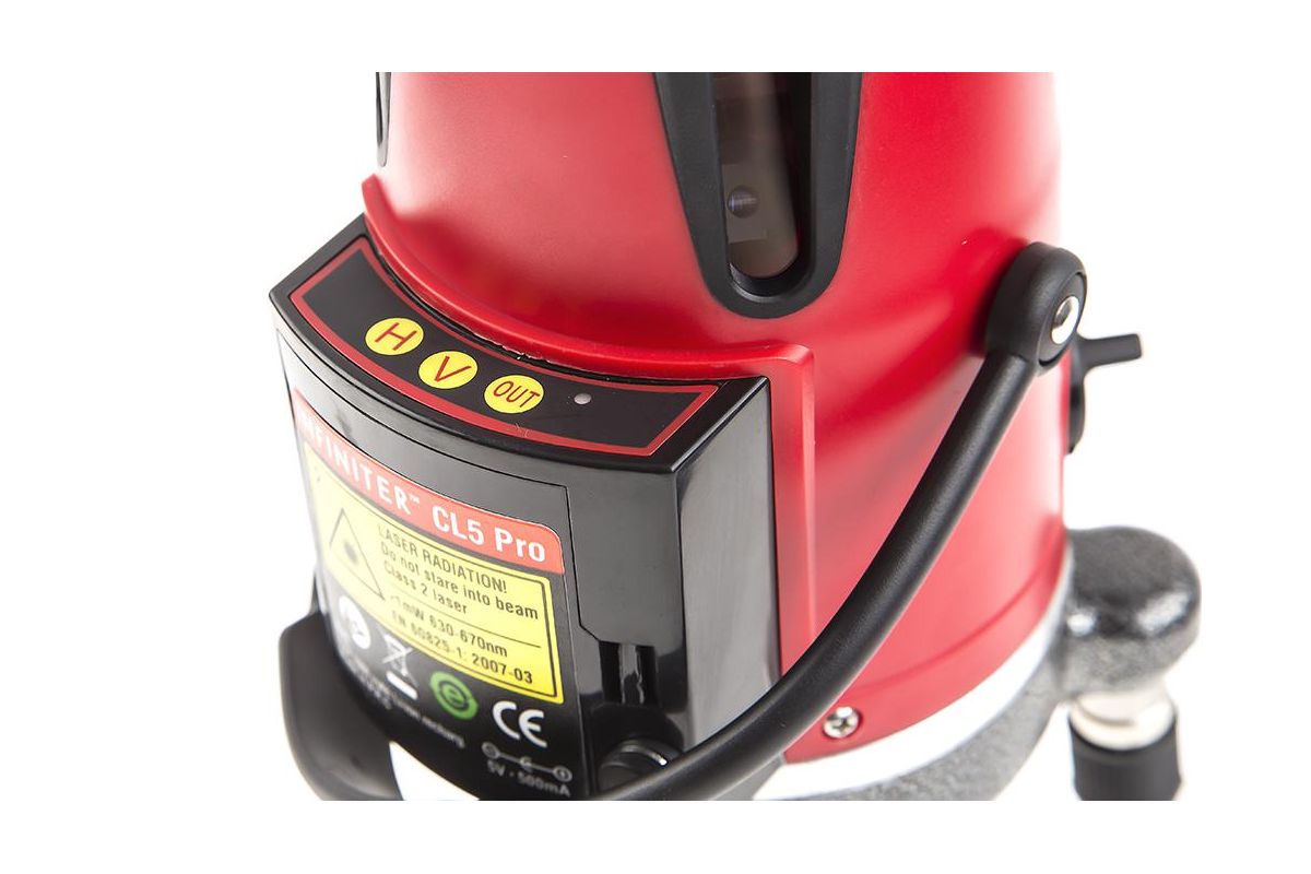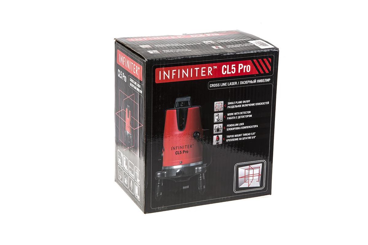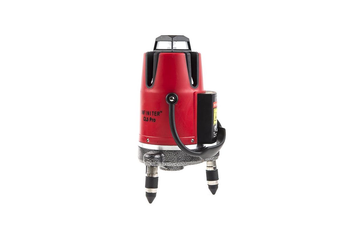 INFINITER CL5 Pro – профессиональный мультипризменный лазерный нивелир. Строит четыре вертикальные и одну горизонтальную линию, а также точку отвеса (надир). Подходит для работы в закрытых помещениях и на открытых стройплощадках. Дальность работы – 20 м. Возможная погрешность – 0,03 мм/м.