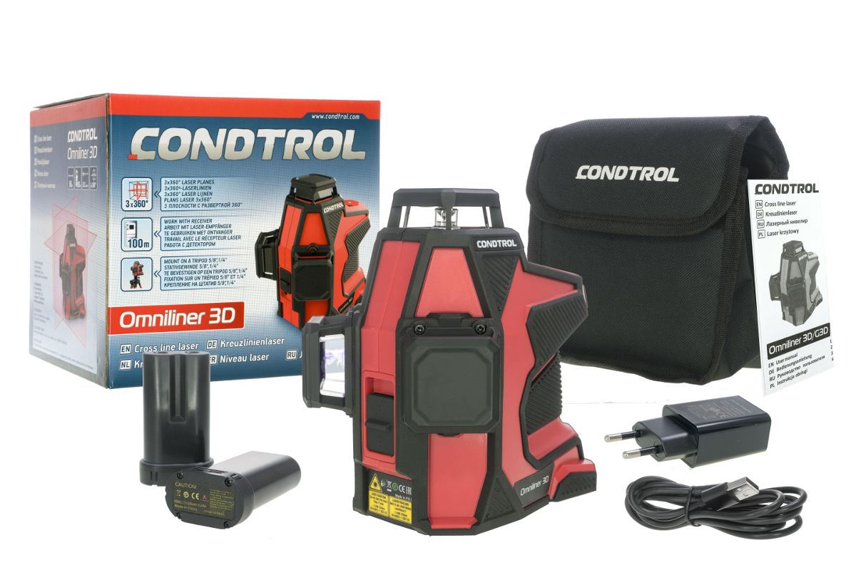CONDTROL Omniliner 3D – многофункциональный лазерный нивелир. Пригодится для разметки, ремонта, декорирования помещений. Строит три круговых проекции: две вертикальные и одну горизонтальную. Дальность работы – 50 м (100 м с приёмником). Погрешность – не больше ±0,2 мм/м.