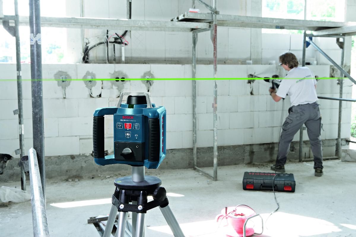 BOSCH GRL 300 HVG Professional — лазерный нивелир для разметки на крупных строительных объектах. Дальность действия — до 300 м (с приемником). За счет этого подходит для масштабных работ на открытом воздухе. Среди особенностей — точность, надежность, простая настройка и обслуживание. Кроме того, зеленый лазер четче и воспринимается лучше красного. Прибором можно работать в экстремальных условиях — дождь, снег, пыль, при температуре от -20 до +50.