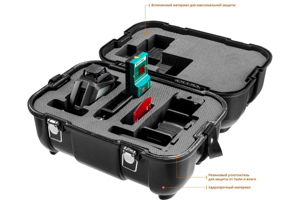 Лазерный нивелир поставляется в прочном кейсе. Отсеки внутри надёжно фиксируют прибор и оснастку.