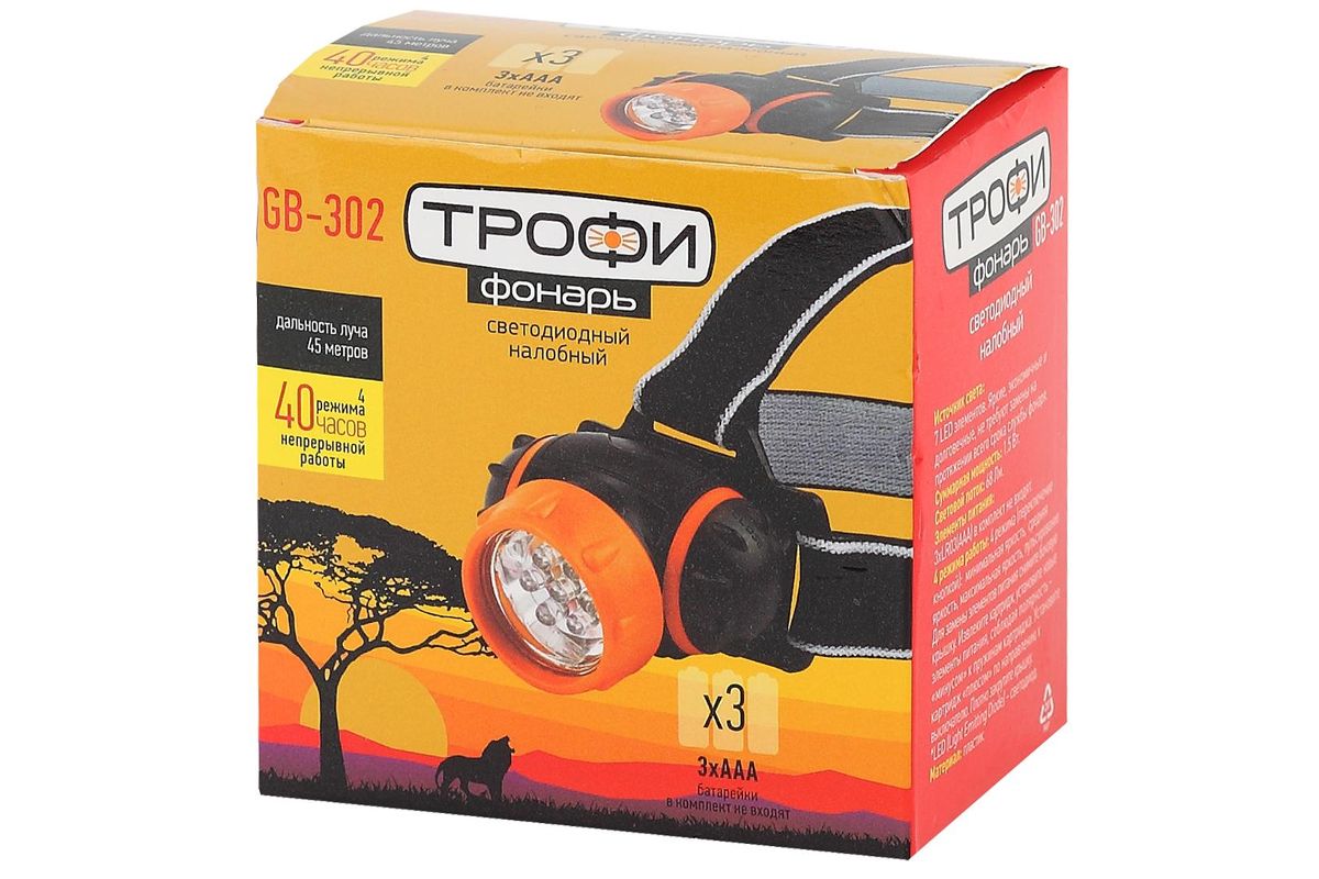 Фонарь Трофи GB-302 (Б0036617) Налобный 7xLED, 3хААА, карт