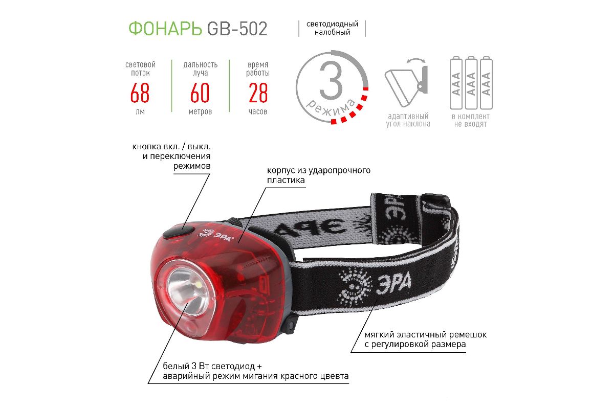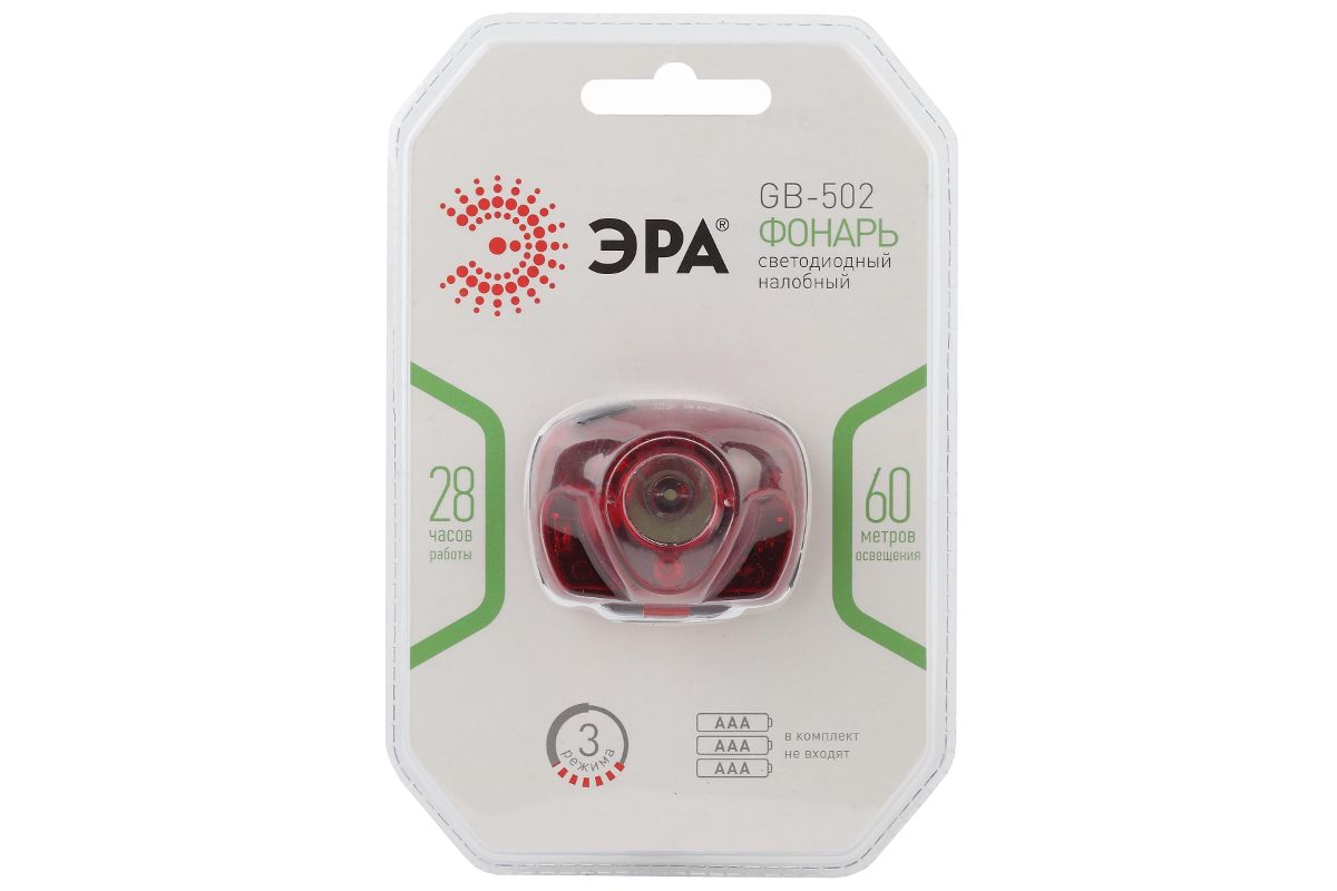 Фонарь ЭРА GB-502 (Б0036615) Налобный 3W LED, аварийный сигнал, 3хААА, 4 режима, бл.