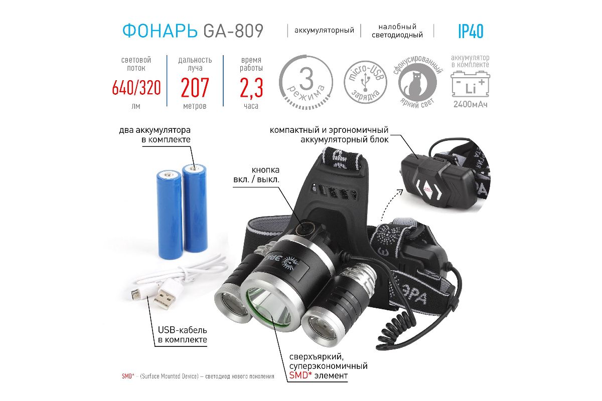 ЭРА GA-809 - яркий налобный LED-фонарь с тремя лампами High Power HeadLamp и емким литиевым аккумулятором.