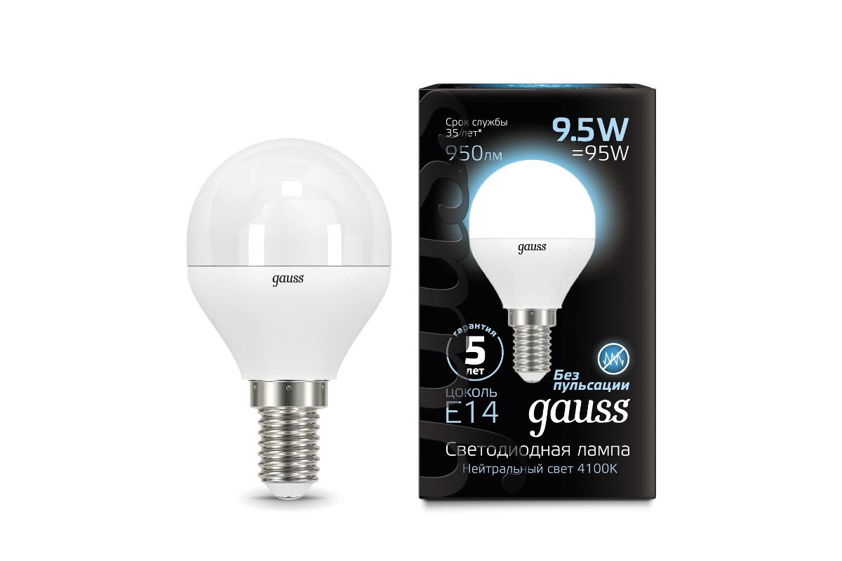 Лампа Gauss LED Шар E14 9.5W 950lm 4100K 1/10/50