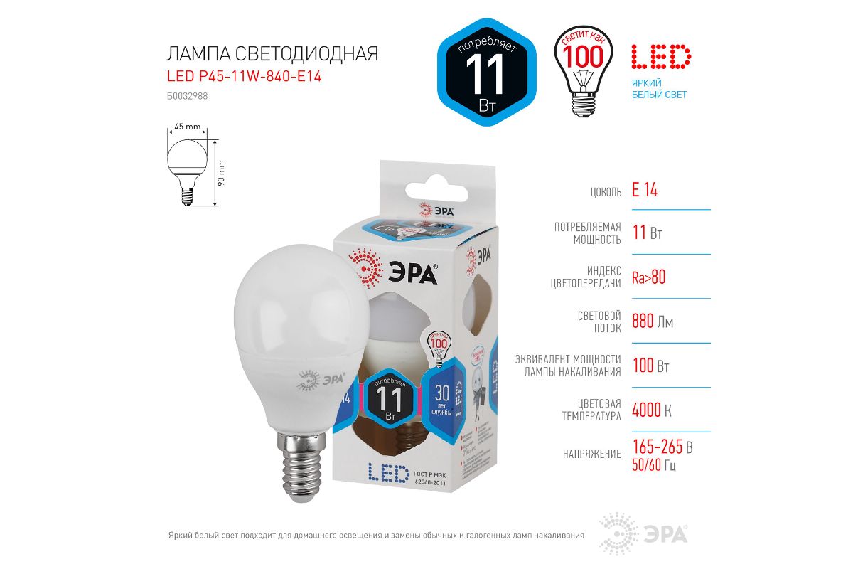 Лампа светодиодная ЭРА LED P45-11W-840-E14 (Б0032988) (диод, шар, 11Вт, нейтр, E14)