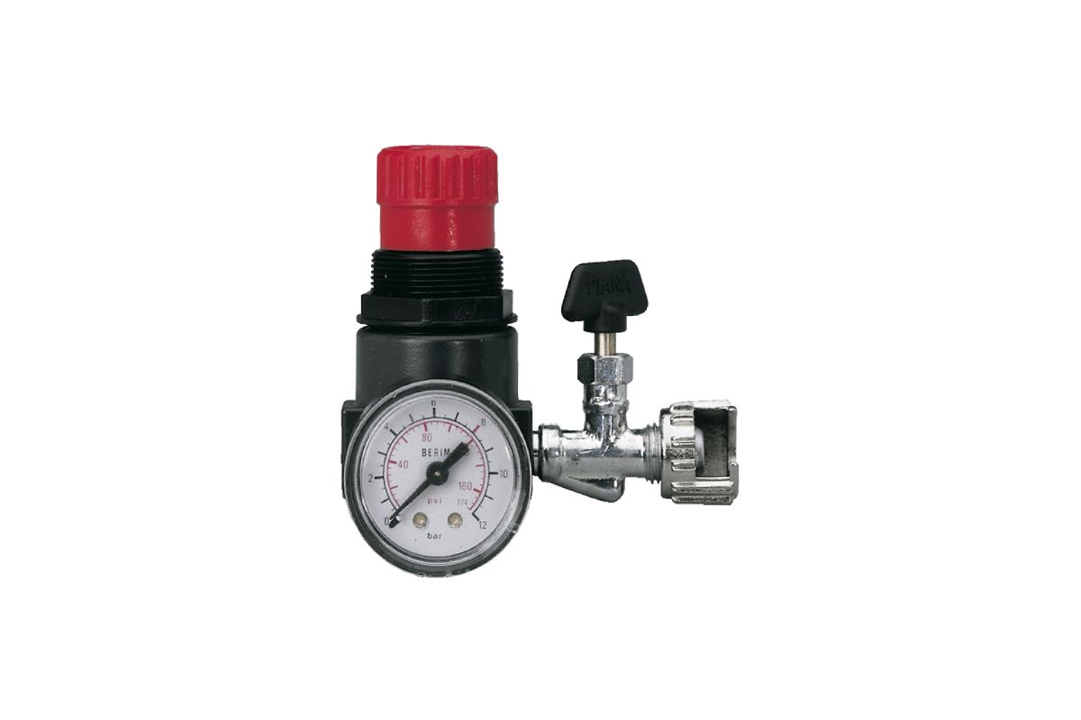 Миниредуктор выходной с игольчатым вентилем и манометром (в сборе). Вход: F 1/4'', выход: F 1/4''. Выходной игольчатый вентиль с наружной резьбой М 1/4'' и полугайкой под байонет. Шкала манометра: 0-12 бар.