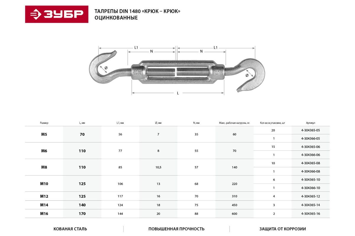 Талреп ЗУБР крюк-крюк M10 1 шт. (4-304366-10)
