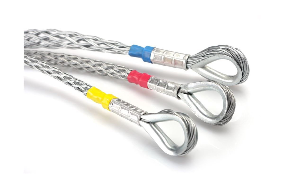 чулки монтажные кабельные n Предназначены для захвата кабеля, а также несущей нейтрали или скрутки СИП с торца при укладке и протяжке кабеля n Соединяются с вертлюгом и тросом-лидером при раскатке СИП в анкерном пролете n Материал: оцинкованная сталь n Специальная конструкция ручного плетения обеспечивает необходимую эластичность n Однородное распределение нагрузки по всей площади захвата кабельного чулка препят- ствует повреждению изоляции и оболочки кабеля n Гибкая утяжная петля позволяет легко про- ходить изгибы в кабельной канализации