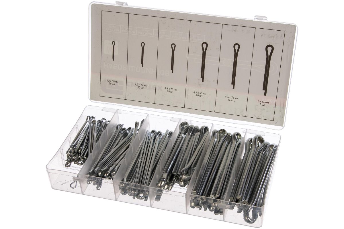 Набор шплинтов СИБРТЕХ 144 предмета 47603 поставляется в компактном кейсе с отсеками, выполненном из пластика.