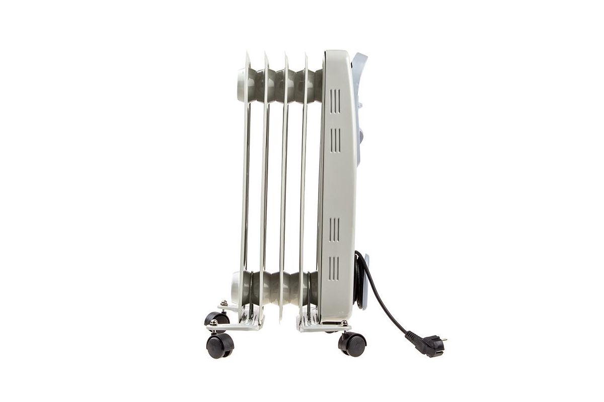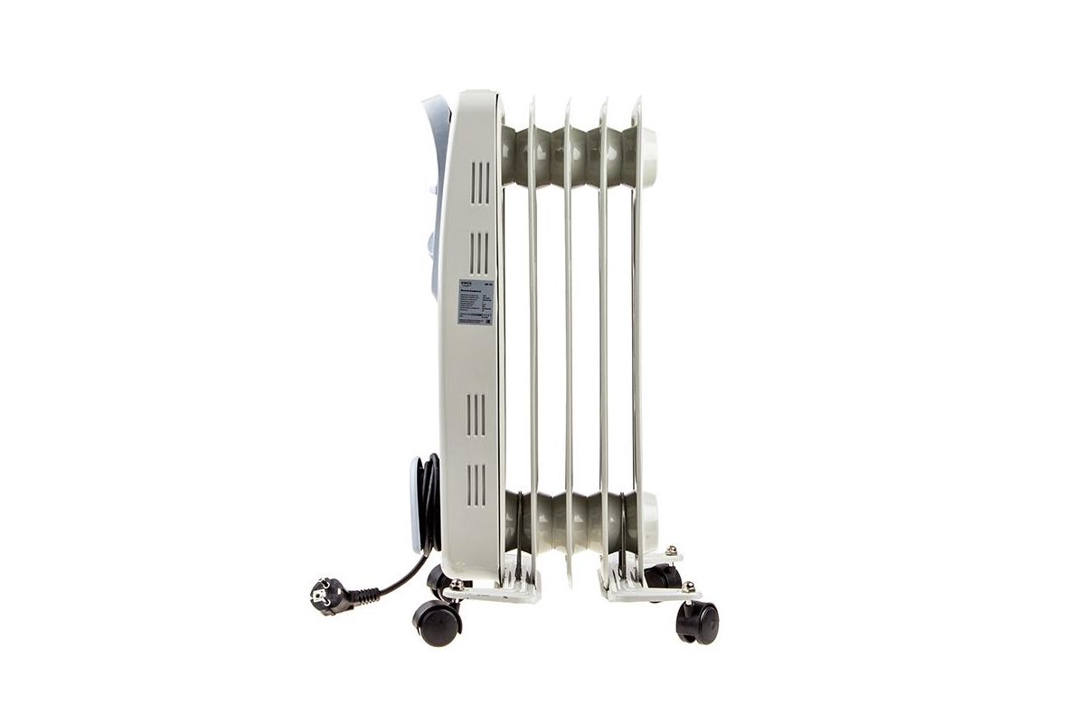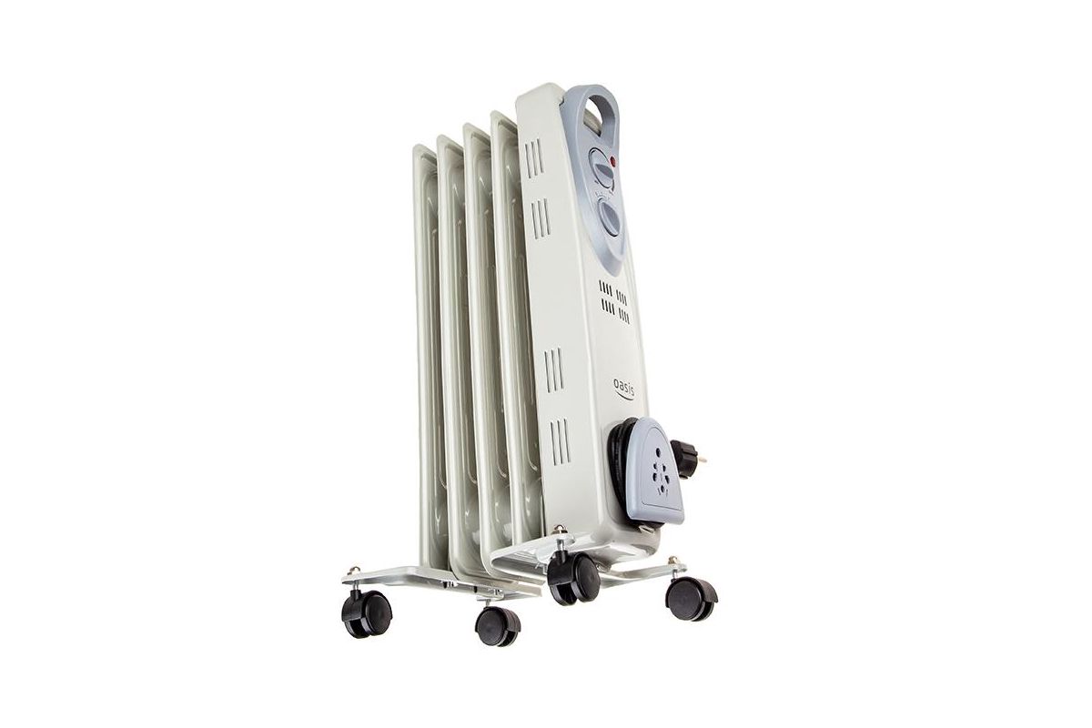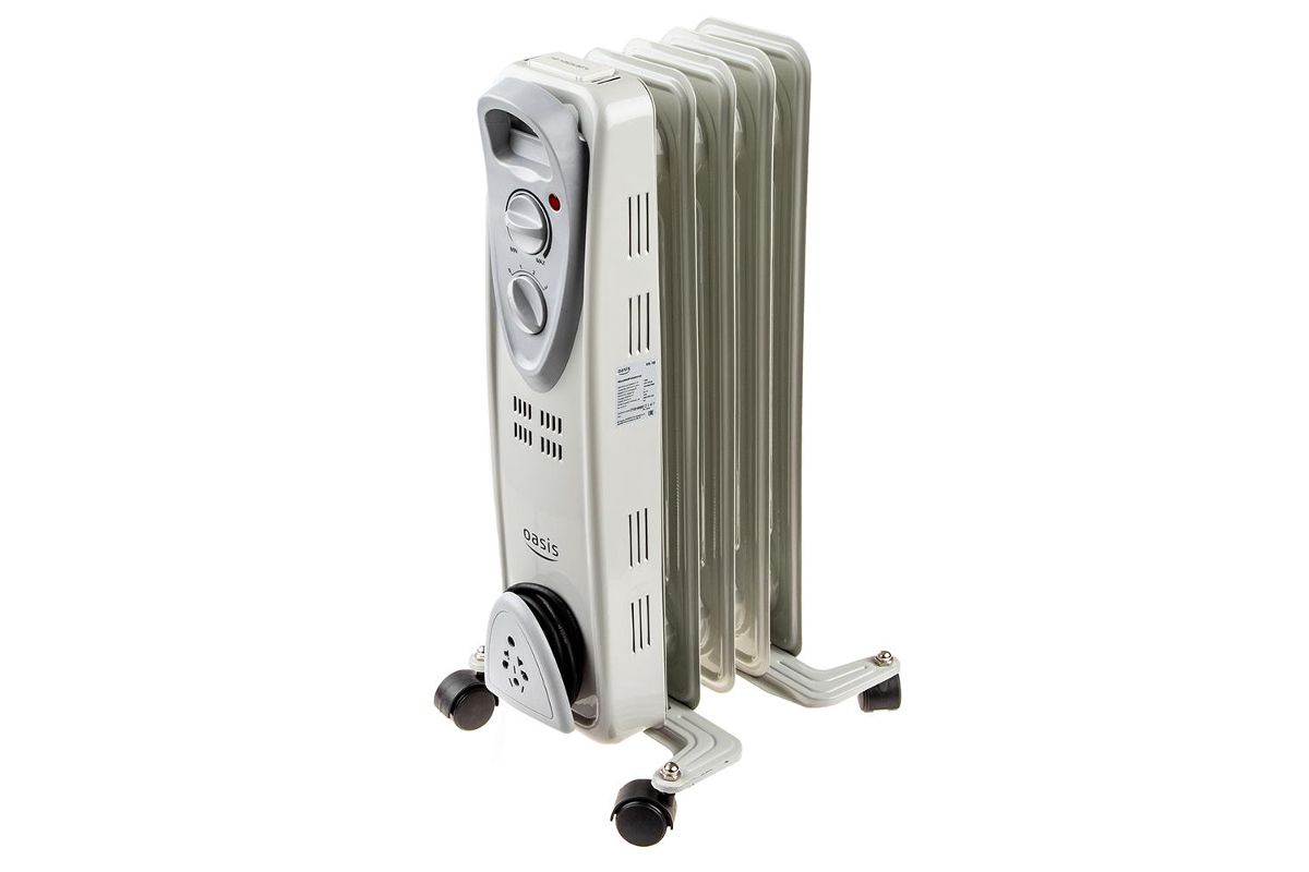 OASIS US-10 – масляный радиатор из пяти секций. Подходит для основного и дополнительного отопления. Мощности 1000 Вт хватит, что прогреть помещение площадью до 10 м2. Прибор будет полезен зимой или в межсезонье.